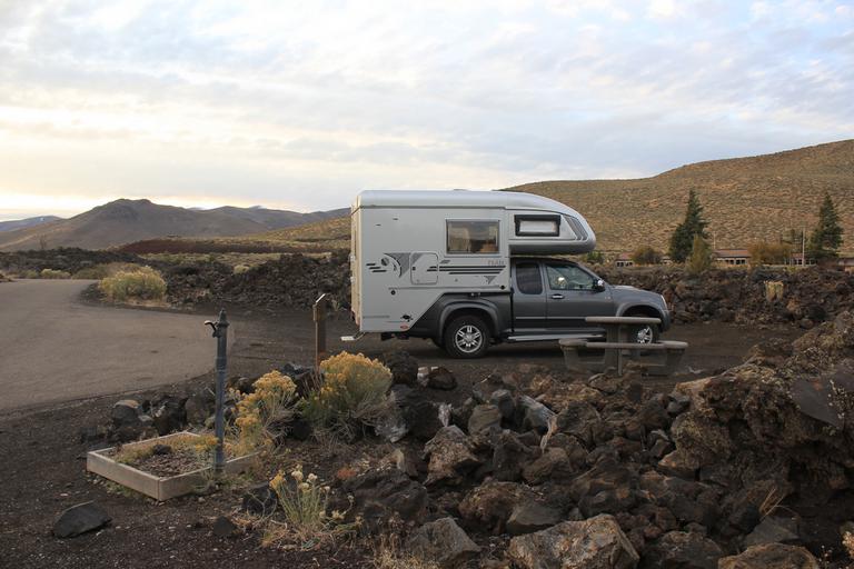 Nous passons une excellente nuit sur ce petit camping. Les 51 emplacements sont répartis entre des gros blocs de lave autour desquels poussent de nombreux arbustes et buissons.