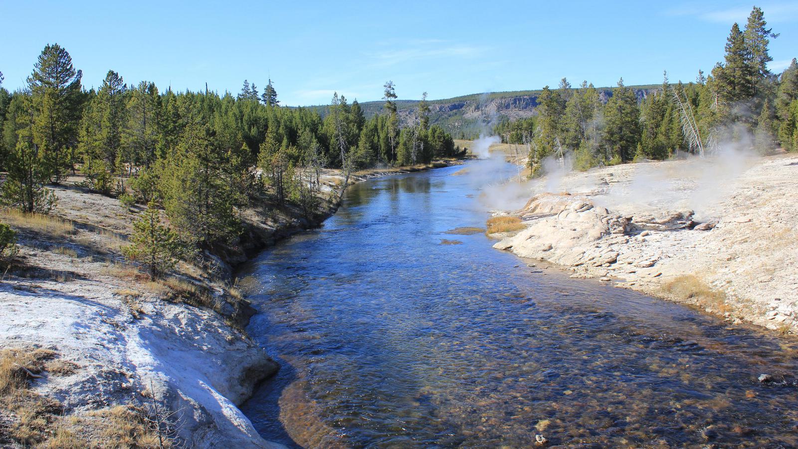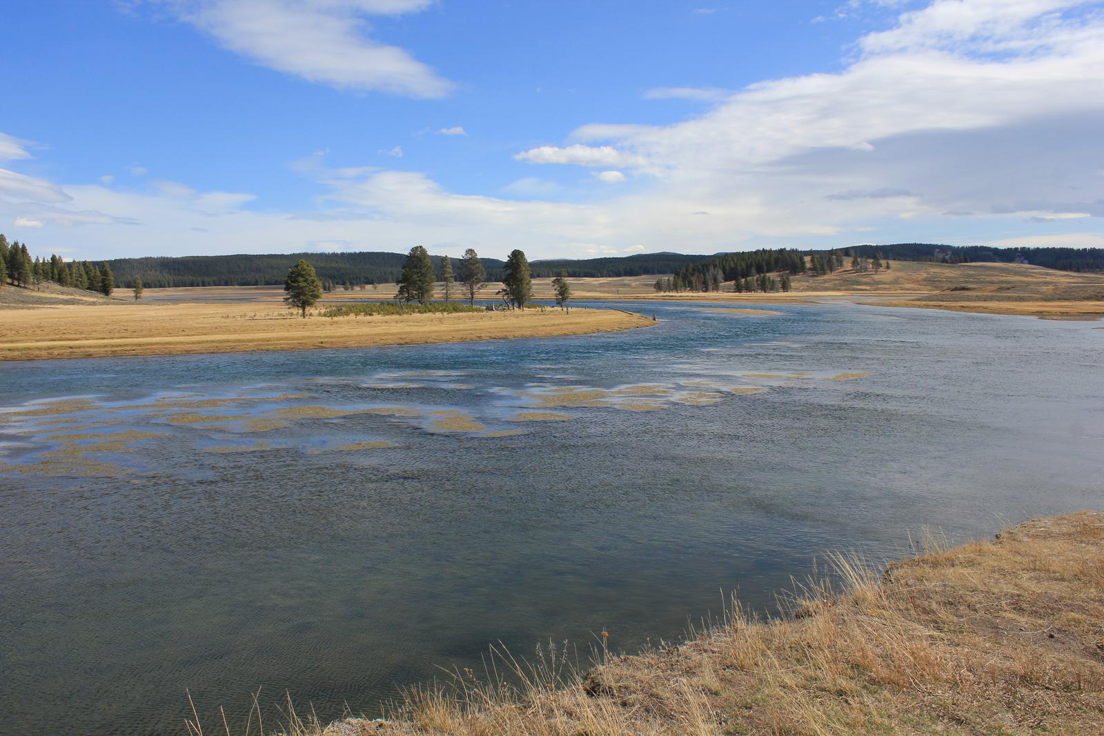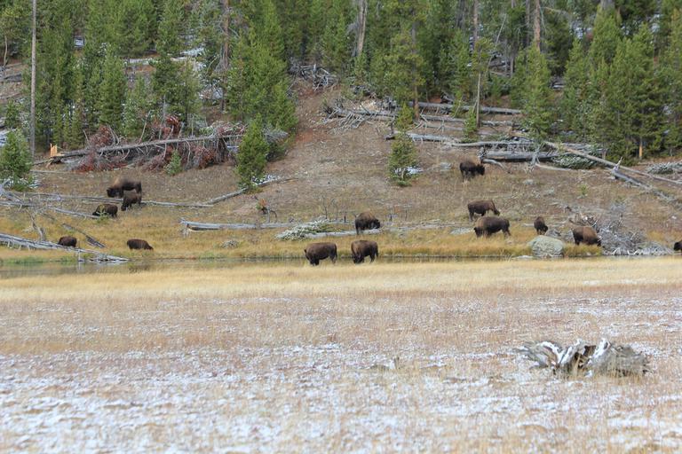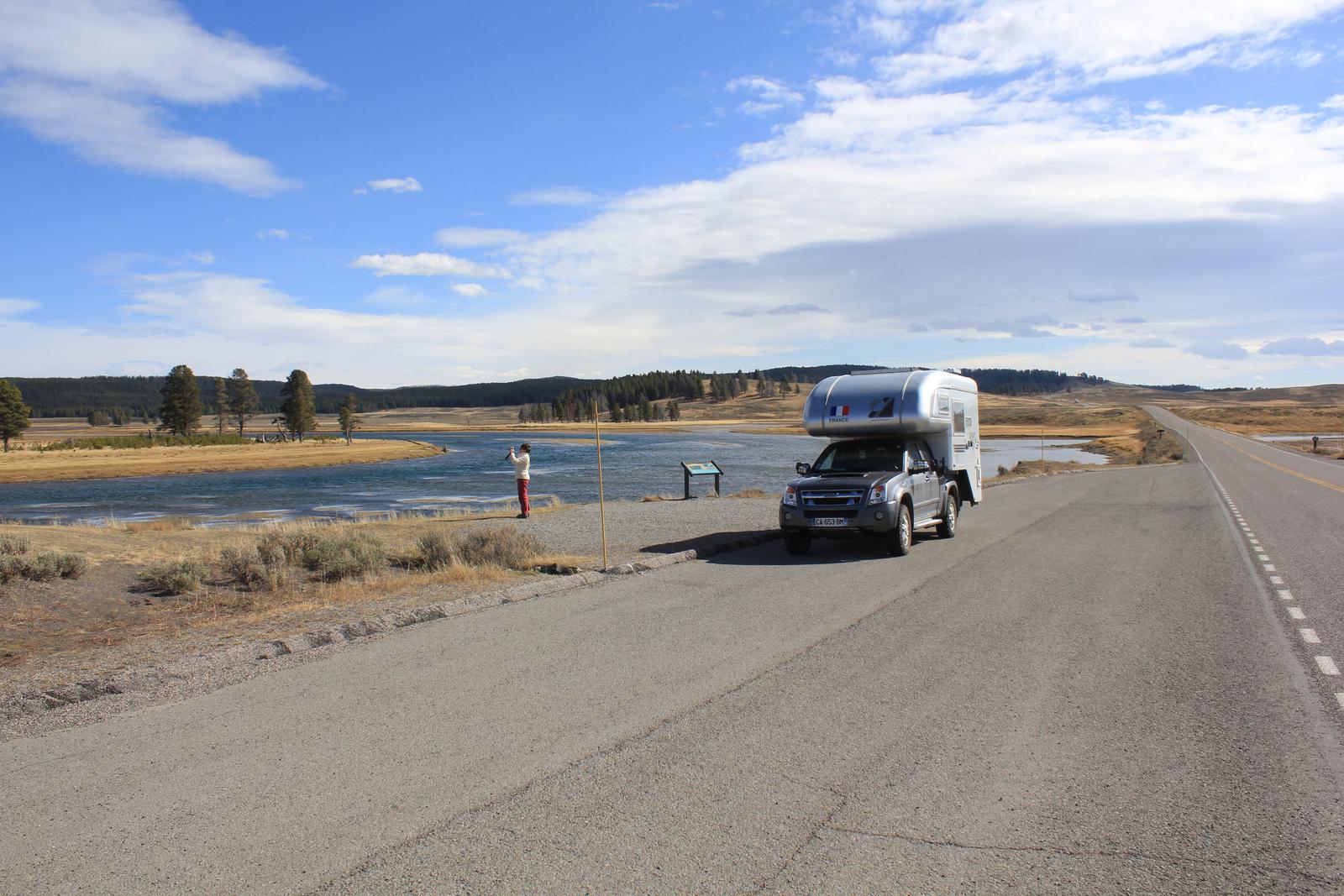 Nous commençons par la boucle du sud en direction de Old Faithfull. La route suit la rivière Firehole, puis quitte la forêt et aborde dans une immense prairie. Nous apercevons déjà un troupeau de bisons broutant sur l'autre rive.
