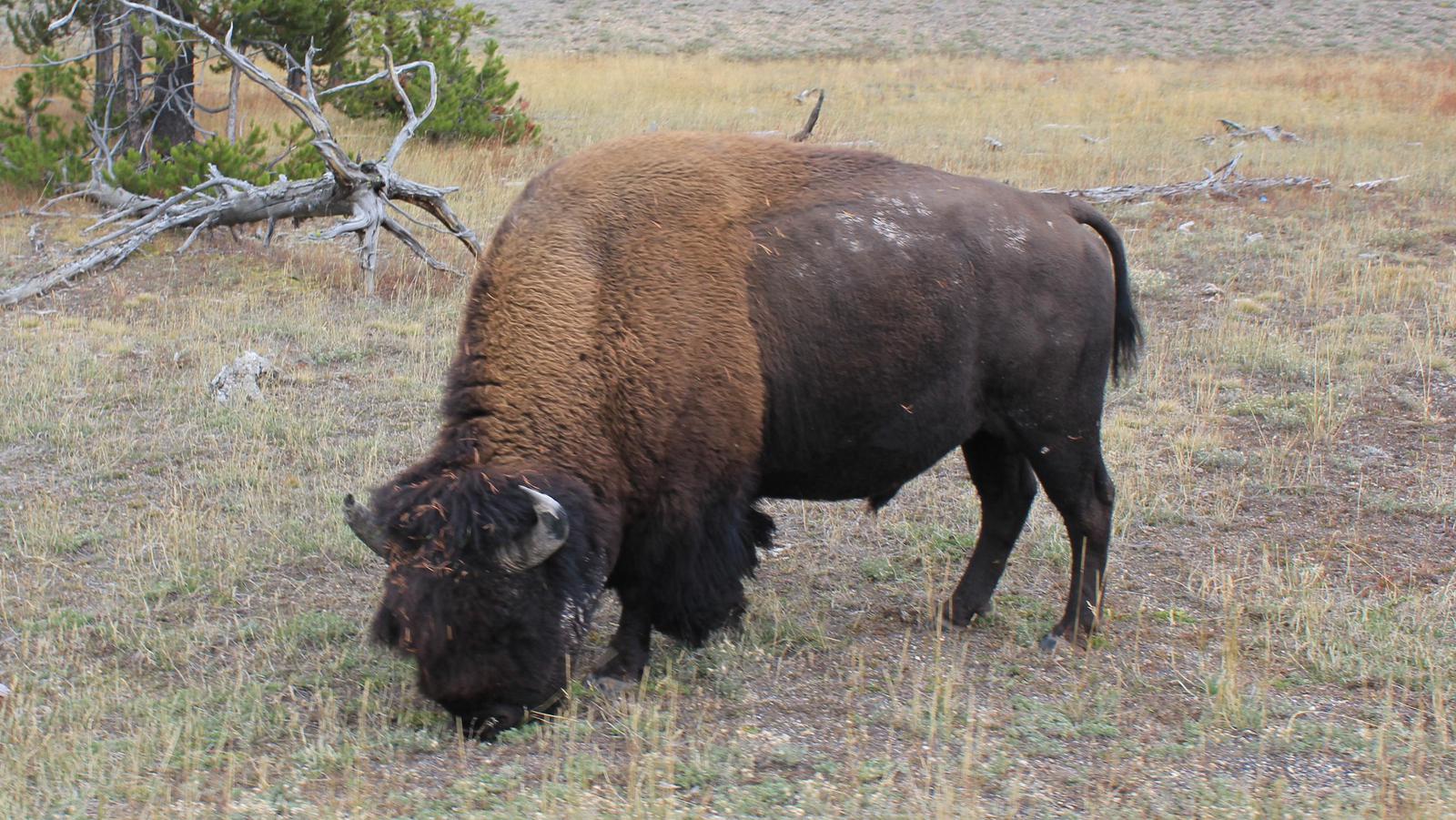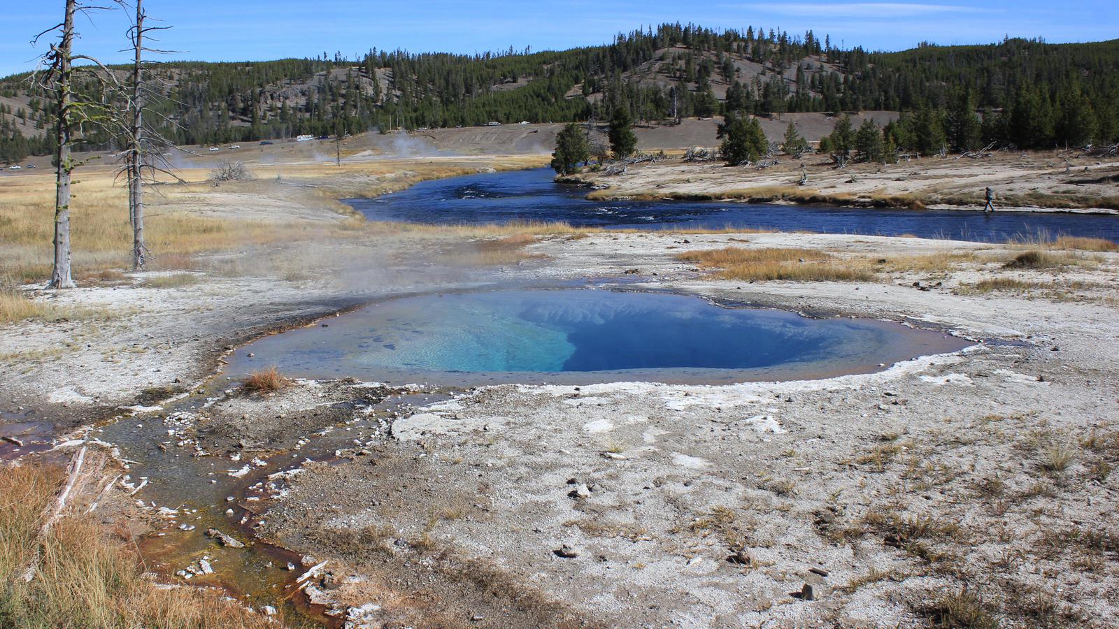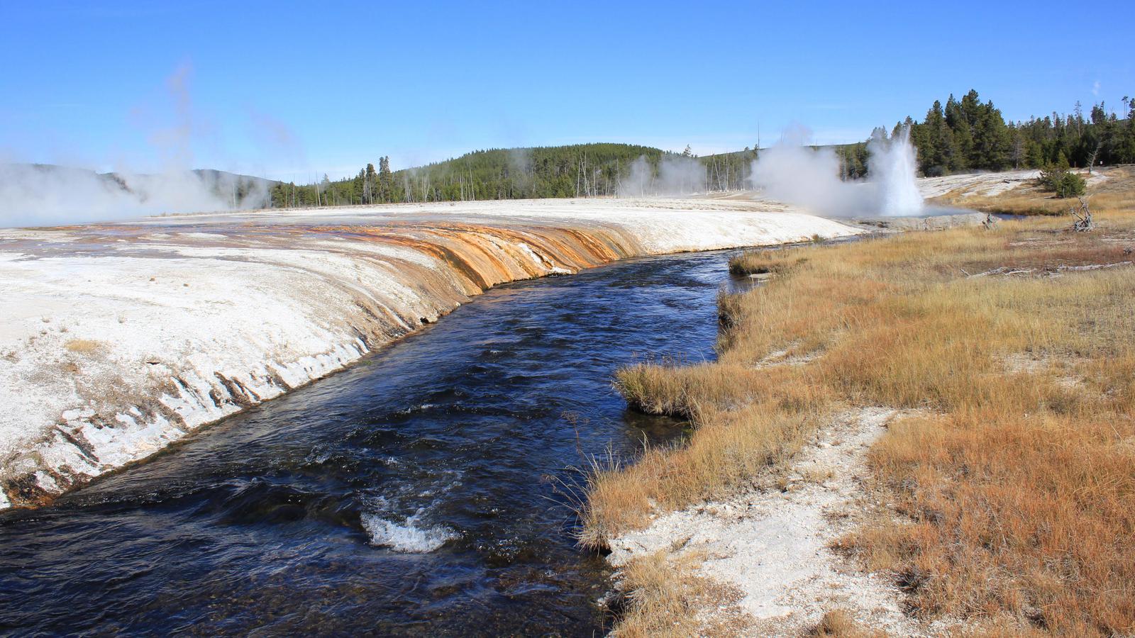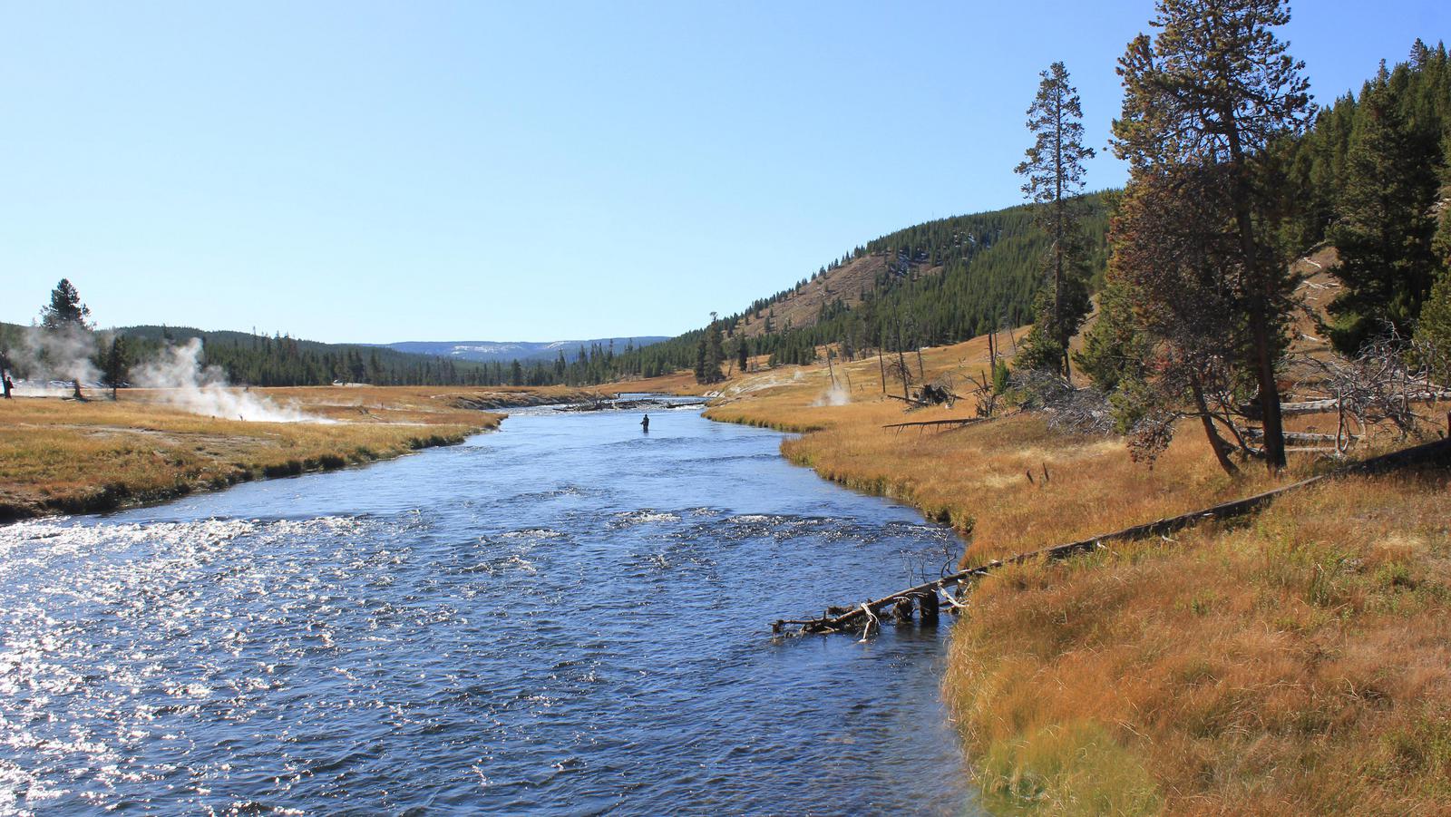 Nous commençons par la boucle du sud en direction de Old Faithfull. La route suit la rivière Firehole, puis quitte la forêt et aborde dans une immense prairie. Nous apercevons déjà un troupeau de bisons broutant sur l'autre rive.