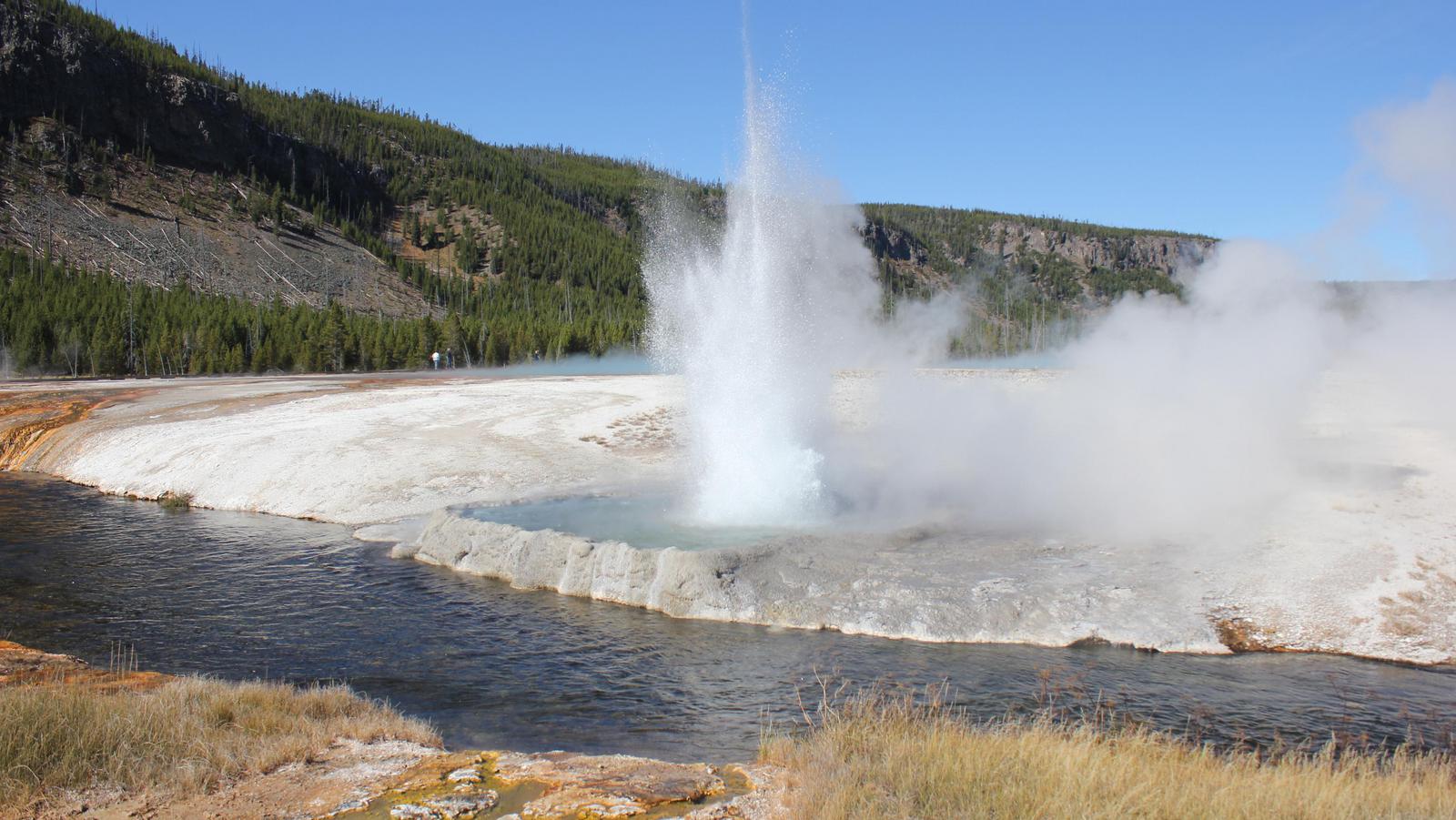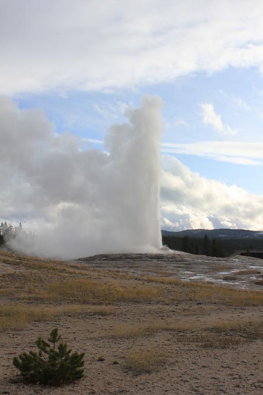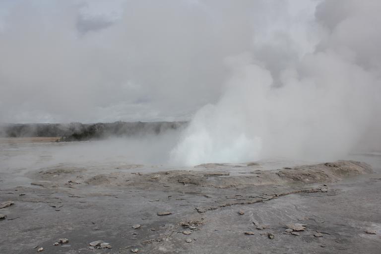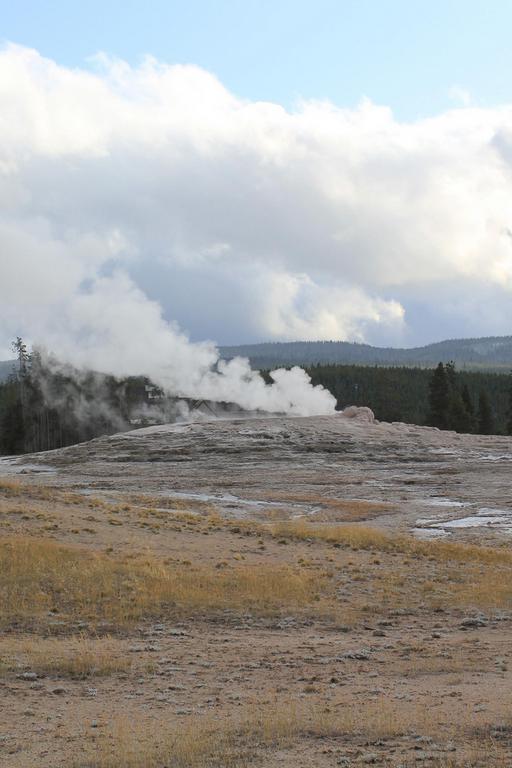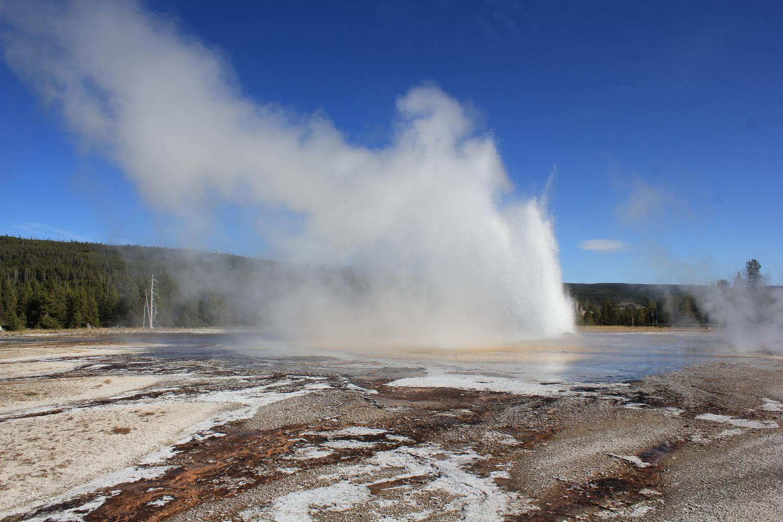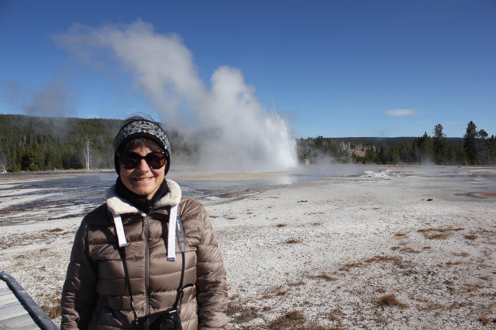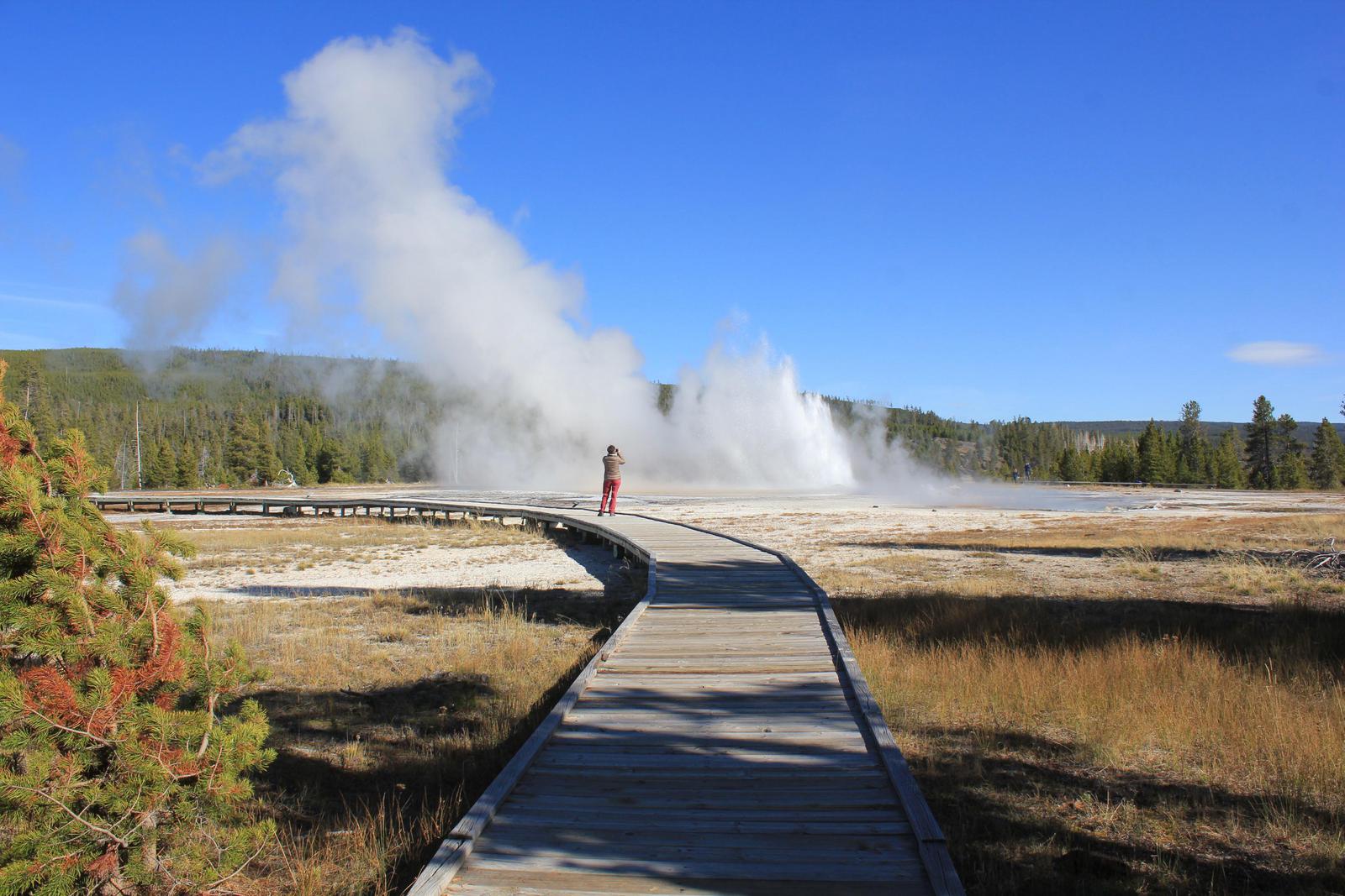 Il est aux environs de 13h00, nous nous apprétons à partir pour West Thumb au sud du parc, lorsque nous nous rappelons soudain que l'éruption de Grand Geyser était prévue pour 14h15. Nous rebroussons chemin et revenons à Old Faithfull.