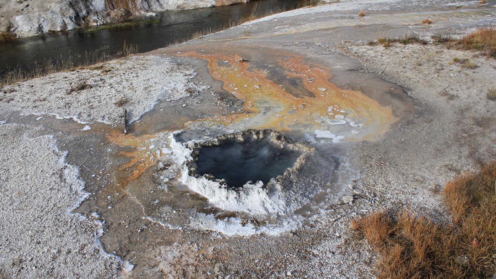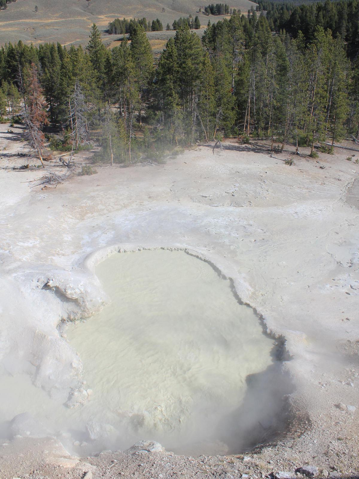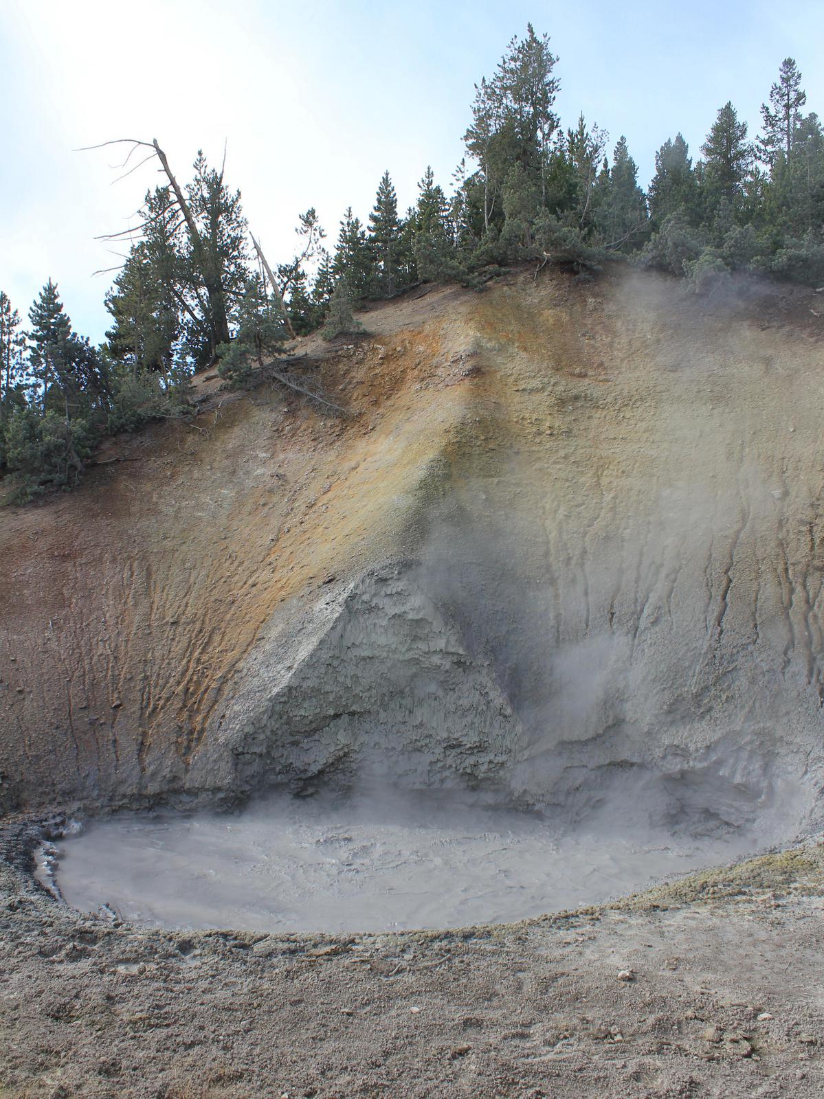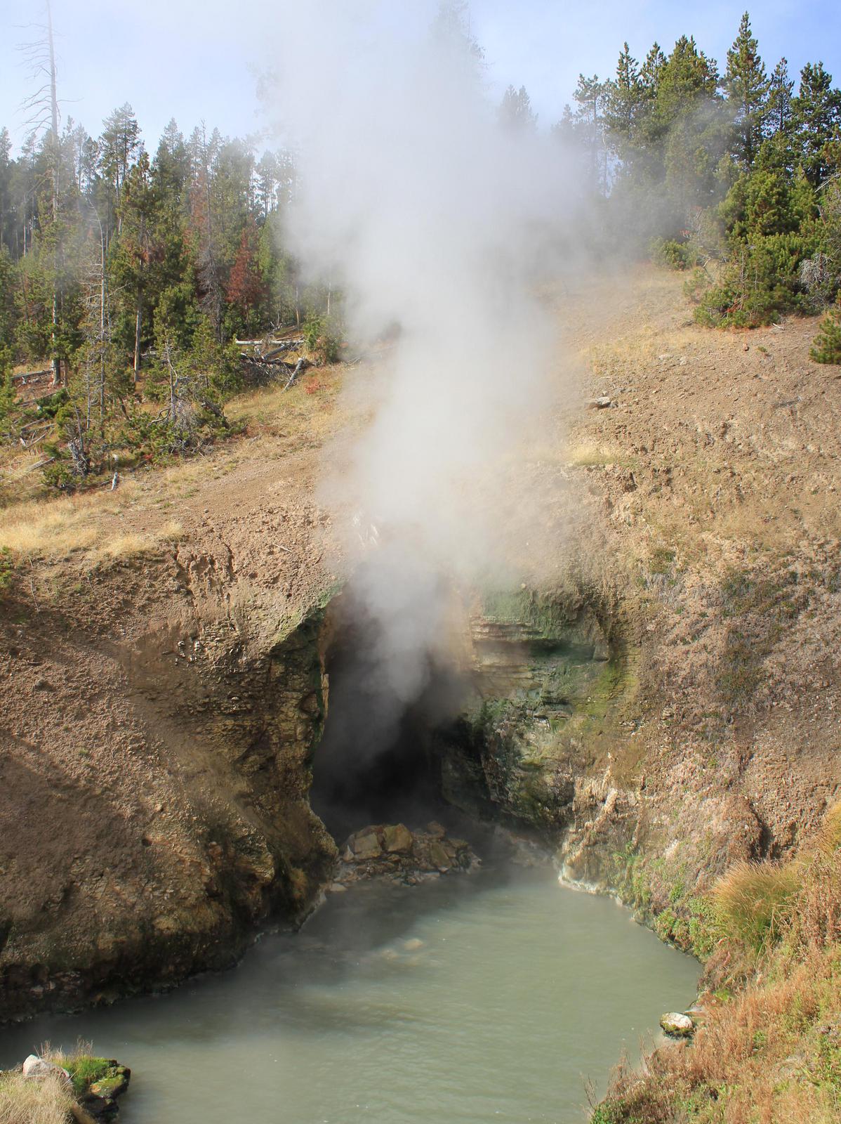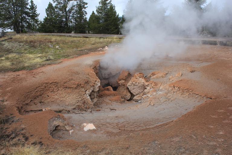 Nous passons l'intersection avec l'entrée Est du Parc et remontons vers le nord en direction de Canyon Village. Nous nous arrêtons ensuite à Mud Vulcano Area, un site géothermique sur lequel nous découvrons une ouverture béante d'où s'échappent des vapeurs et des gaz ainsi qu'un bruit étrange rappelant celui d'un dragon (Dragon's Mouth Spring), une mare bouillonnante de couleur grise fortement agitée (Black Dragon's Caldron) et quelques geysers en sommeil.