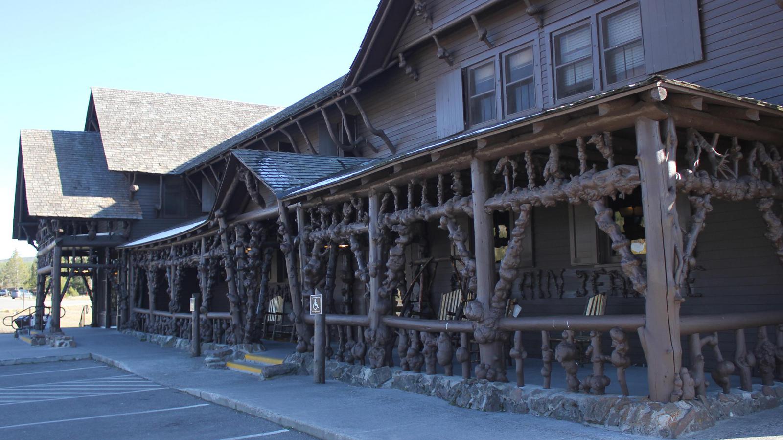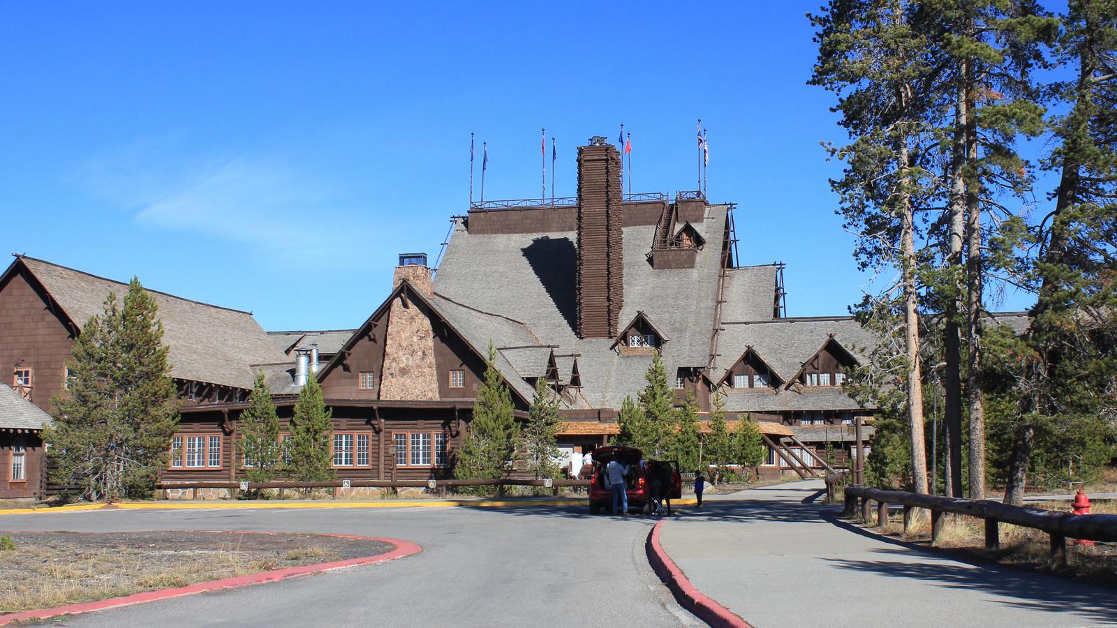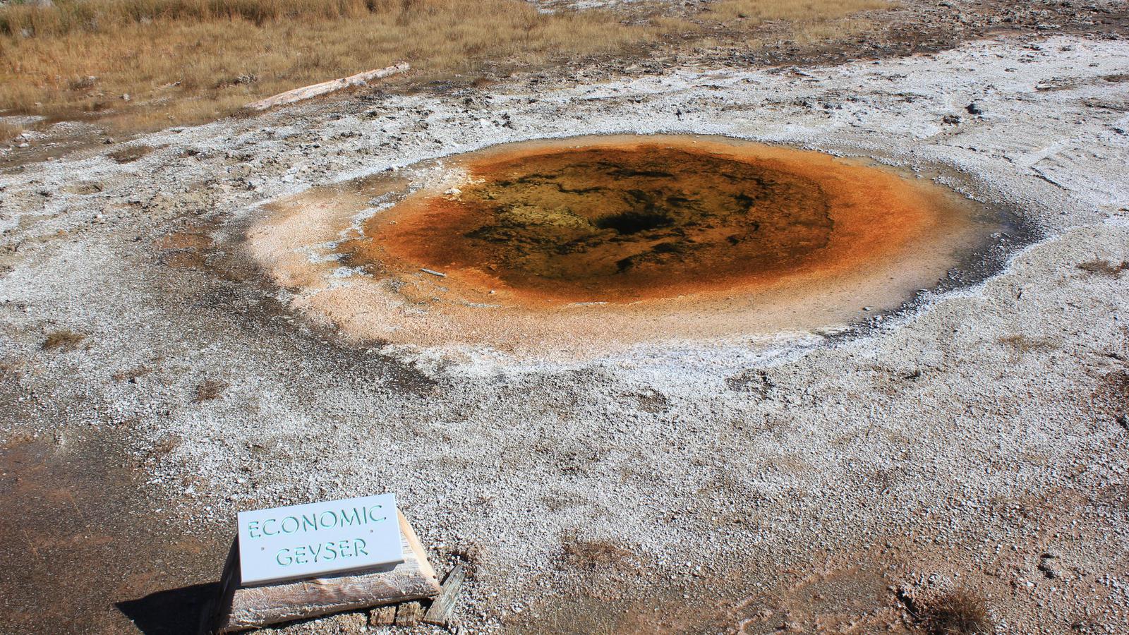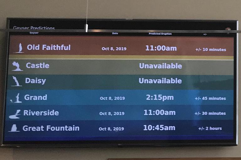 Nous partons ensuite découvrir le Old Faithfull, le plus connu des geysers du parc. Celui-ci se situe exactement devant le bâtiment du Visitor Center. Une place en arc de cercle avec des bancs a été aménagée devant celui-ci, permettant d'assister à ses éruptions comme à un spectacle. Contrairement à d'autres, le Old Faithfull Geyser est très prévisible et les rangers savent les prévoir à quelques minutes près. Aucun horaire n'est indiqué devant le geyser et le centre est fermé, nous partons pour la petite boucle Geyser Hill sur la colline au dessus de celui-ci.