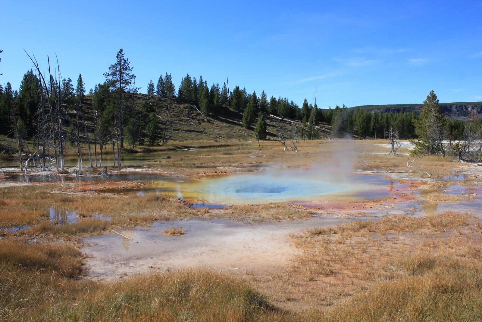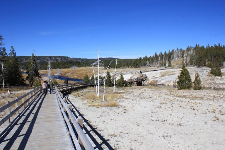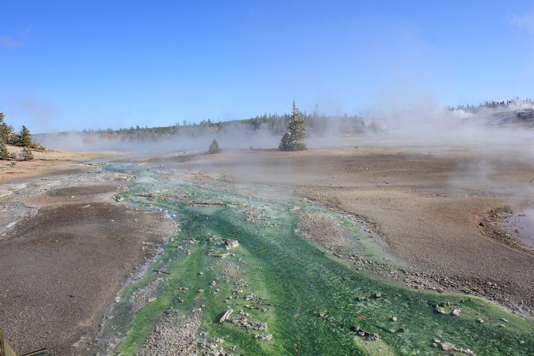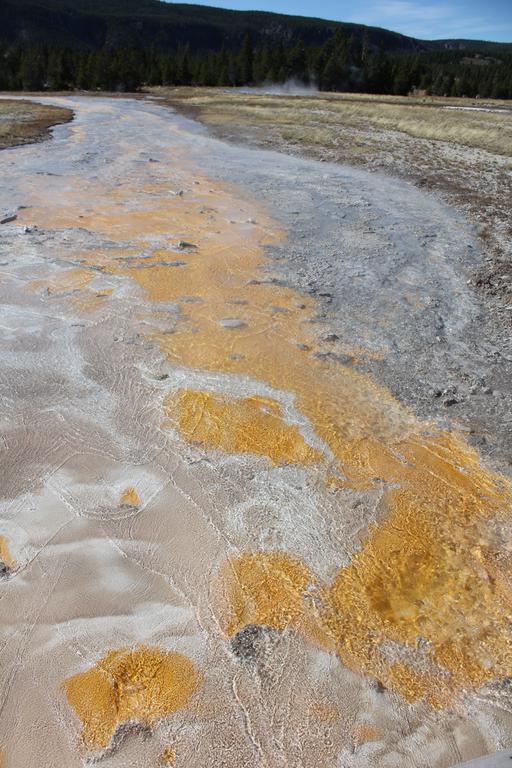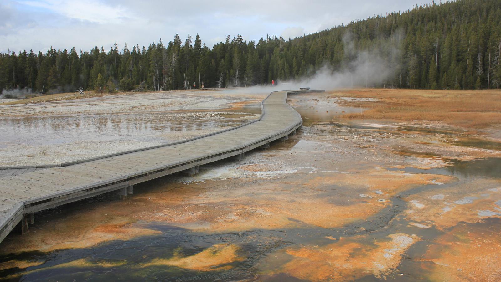 Nous faisons une halte pour voir une source chaude, Ojo Caliente, puis continuons jusqu'à Lower Geyser Basin. Les cheminements en bois nous permettent d'approcher au plus près des sites, aucun ne se ressemble, c'est extraordinaire.