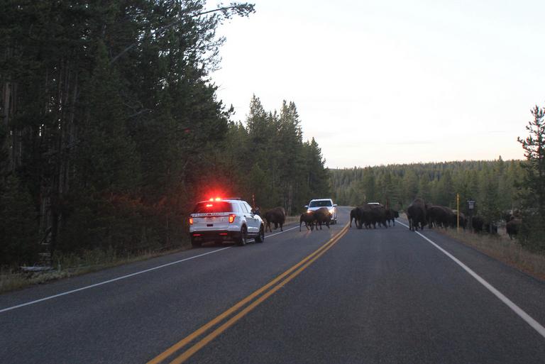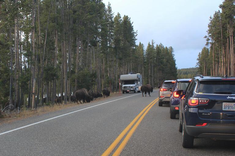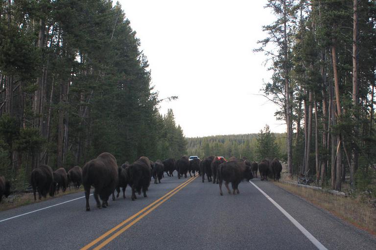 Nous reprenons la route et roulons vers le camping Madisson. Nous retrouvons le troupeau de bisons apercu ce matin, cette fois il est au milieu de la route.