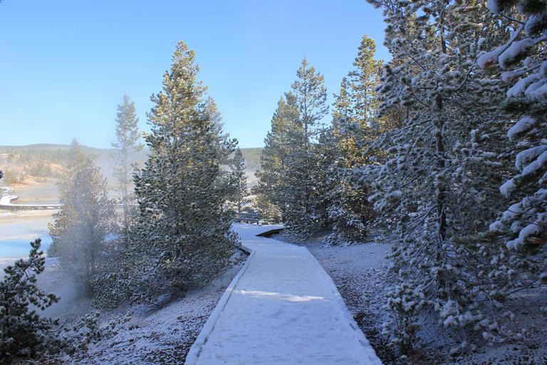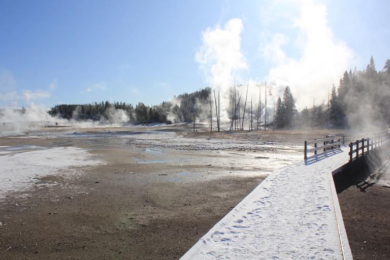 Les cheminements de bois sont couverts de neige gelée, le froid accentue la vapeur et de grands panaches s'échappent de toute part ... Ce site se divise en deux zones : Porcelain Basin au nord et Back Basin au sud. Cette partie est la plus active et la plus chaude du parc, chaque jour de nouveaux petits geysers jaillissent et disparaissent le lendemain.
