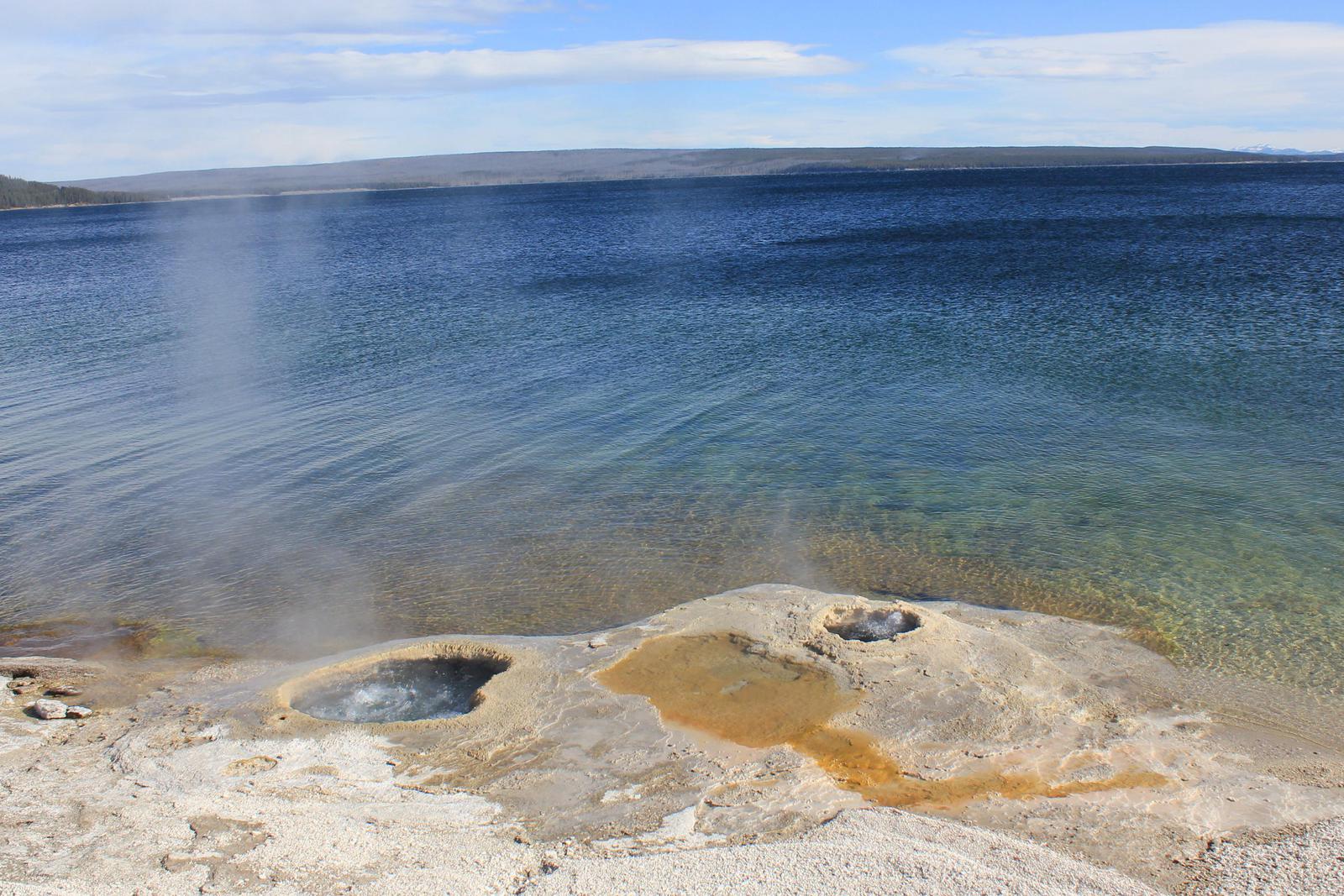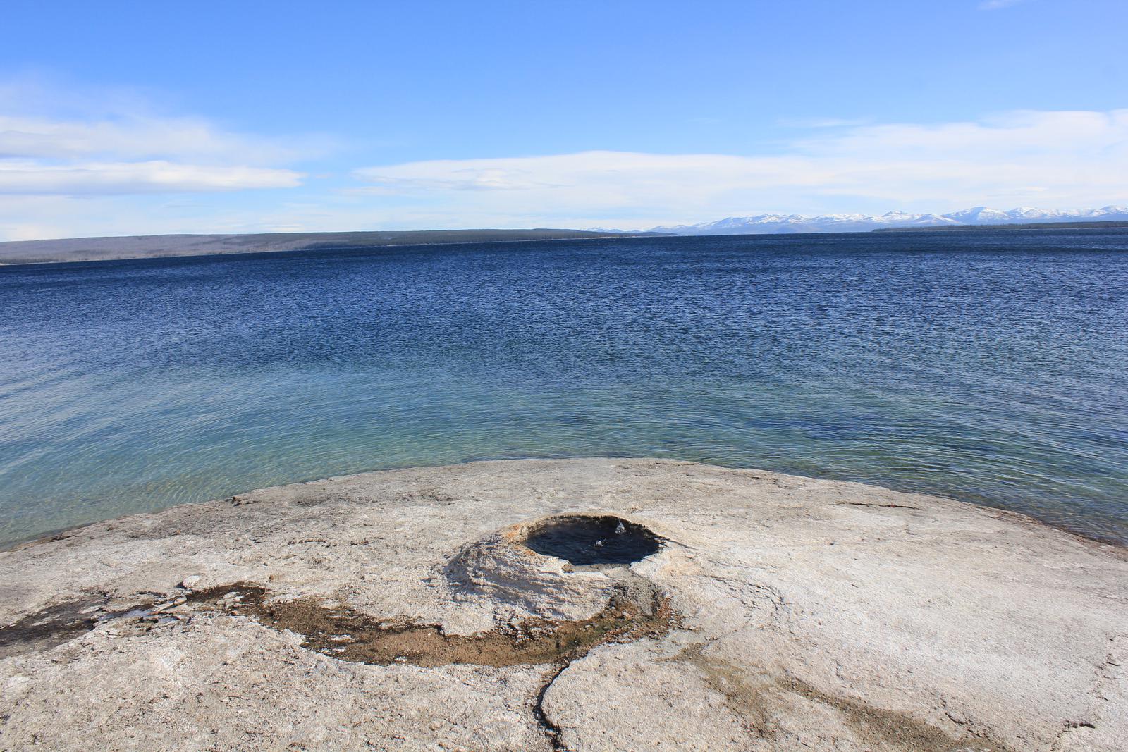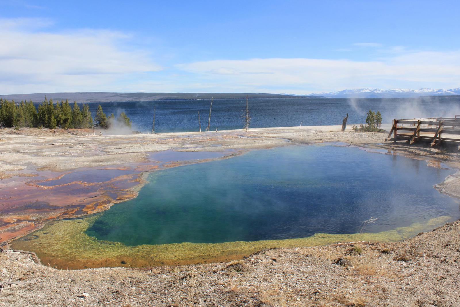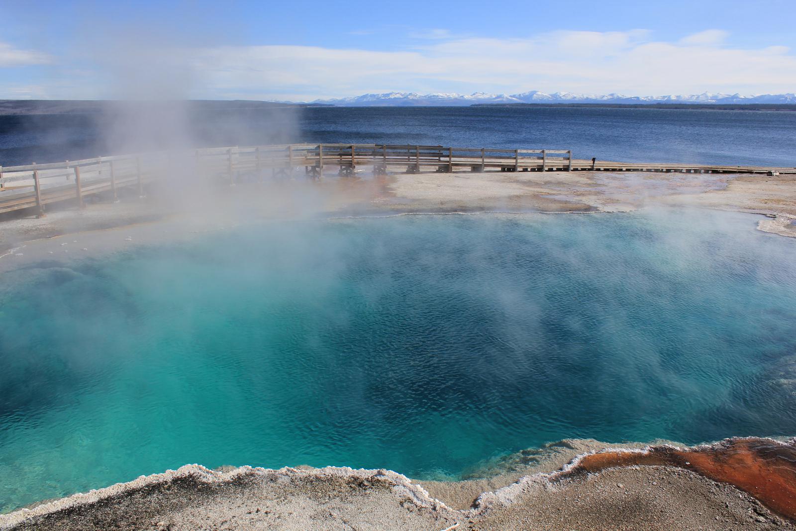 Nous nous arrêtons au West Thumb Geyser Basin. Nous retrouvons ici des piscines de taille et de couleur différentes, dont la magnifique Abyss pool, et quelques petits geysers ayant la particularité d'être entourés d'eau, au milieu du lac. Le lac de Yellowstone reste gelé jusqu'en juin et la présence de ces bains bouillonnants ne suffit pas à réchauffer ses eaux glaciales.