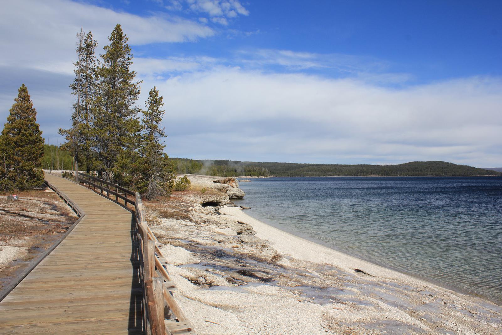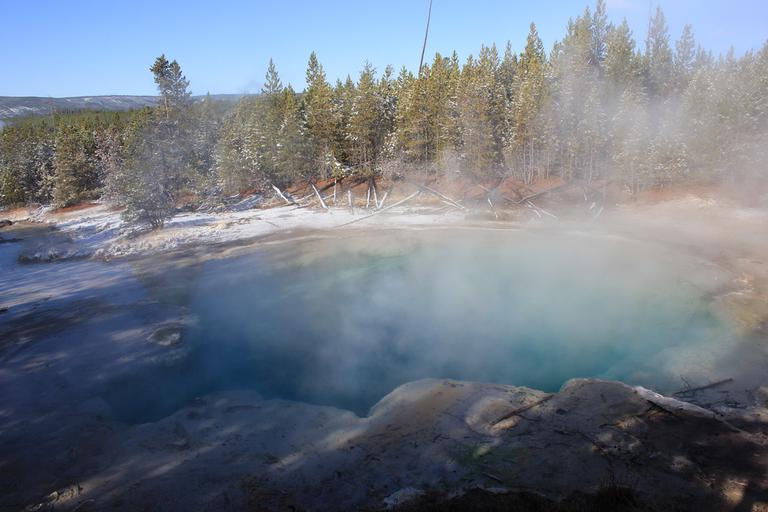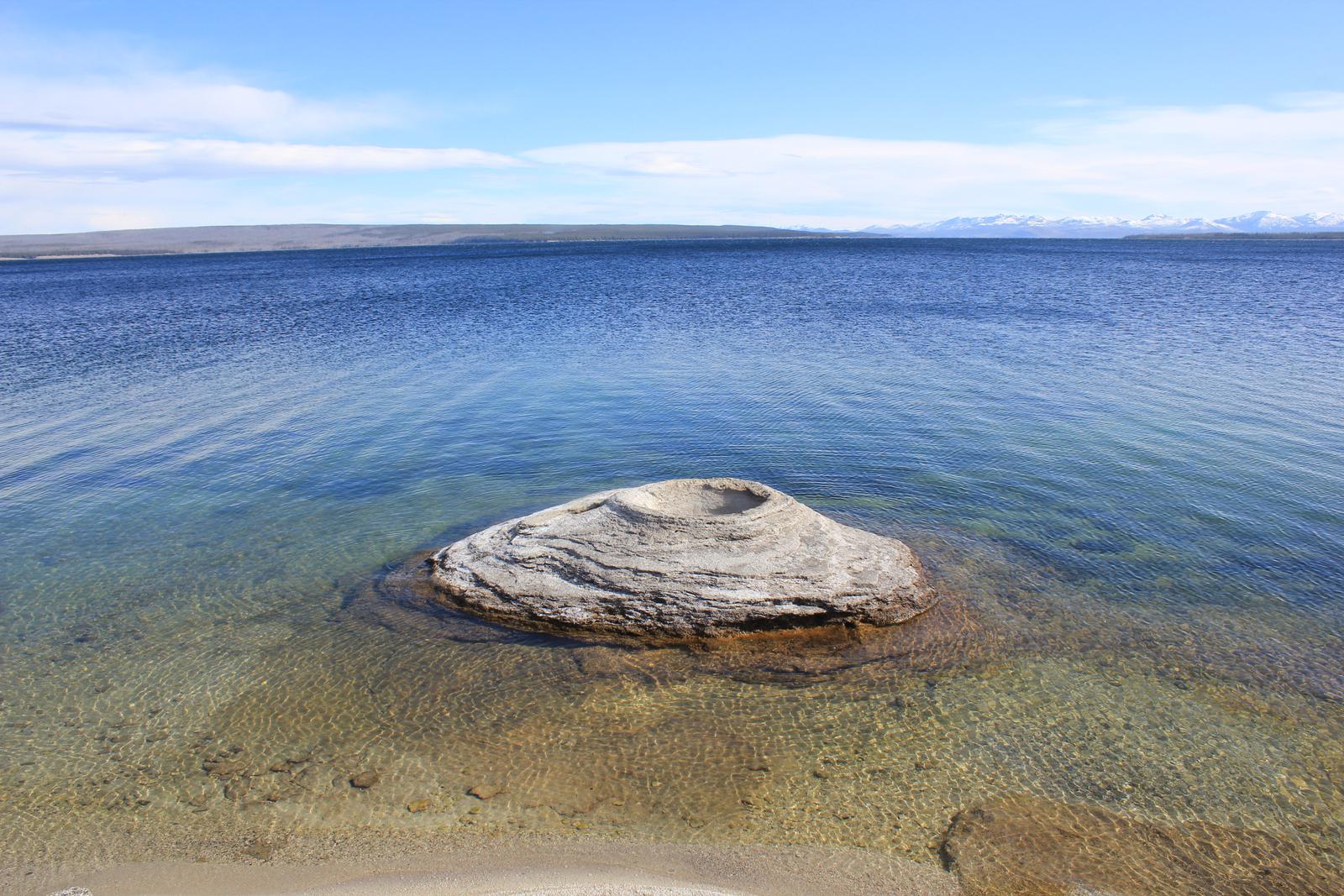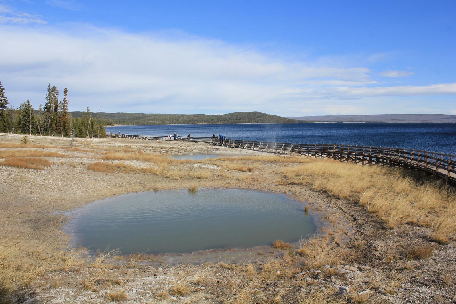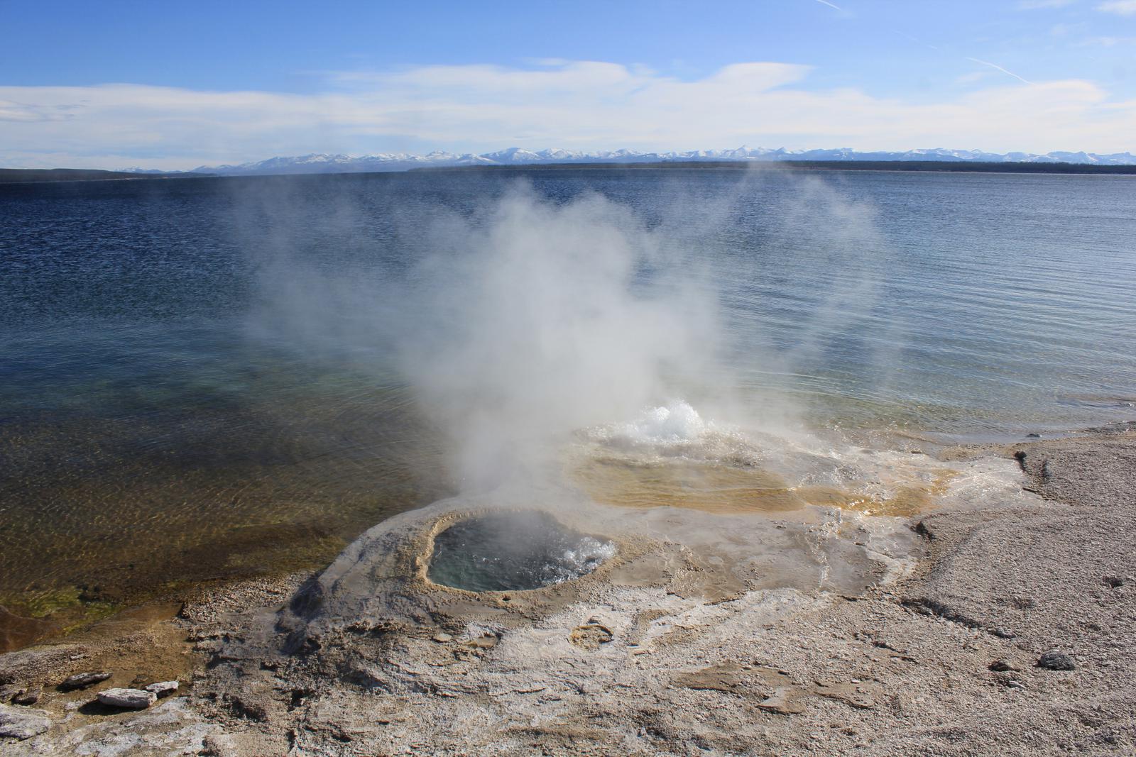 Nous nous arrêtons au West Thumb Geyser Basin. Nous retrouvons ici des piscines de taille et de couleur différentes, dont la magnifique Abyss pool, et quelques petits geysers ayant la particularité d'être entourés d'eau, au milieu du lac. Le lac de Yellowstone reste gelé jusqu'en juin et la présence de ces bains bouillonnants ne suffit pas à réchauffer ses eaux glaciales.