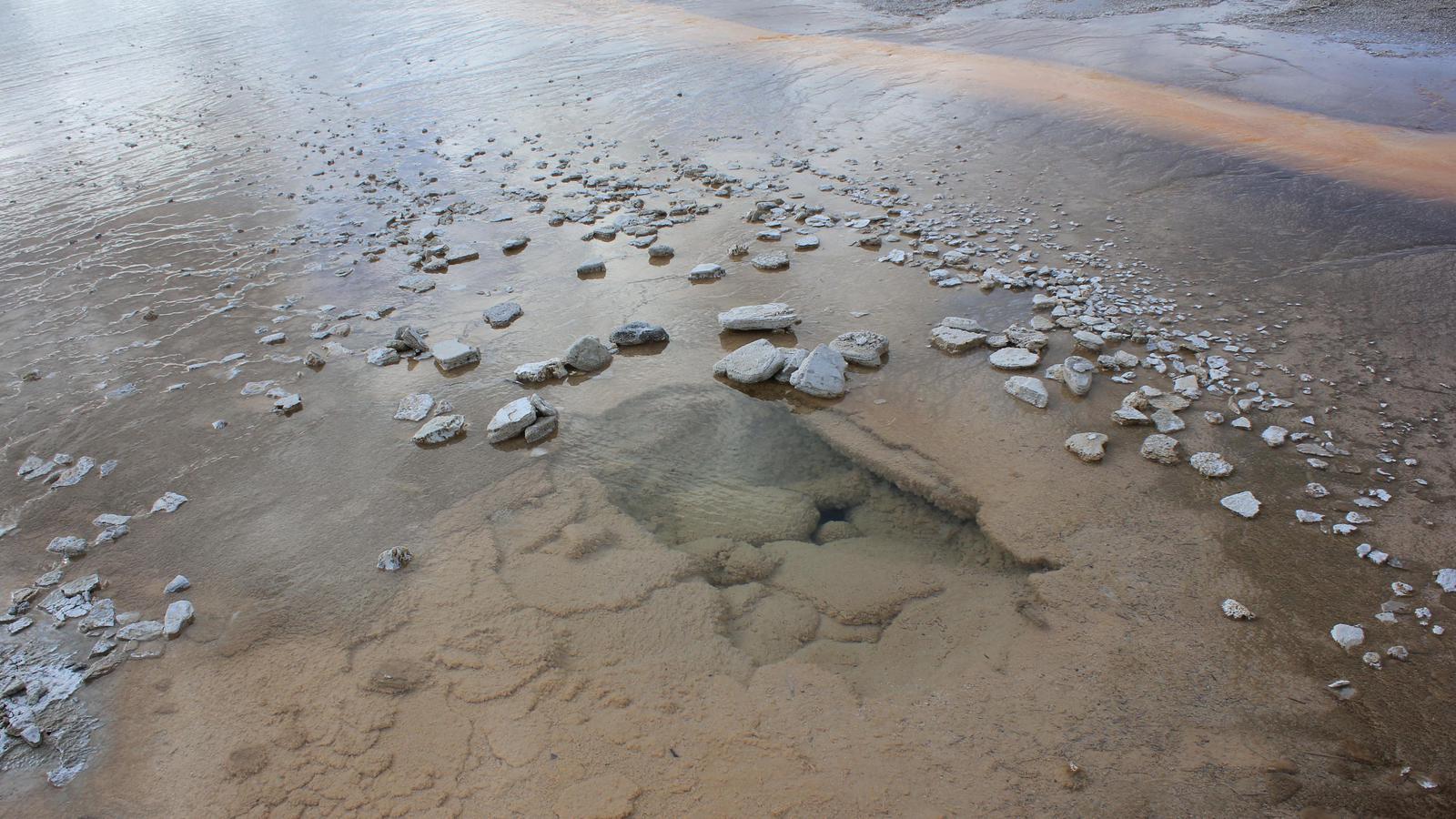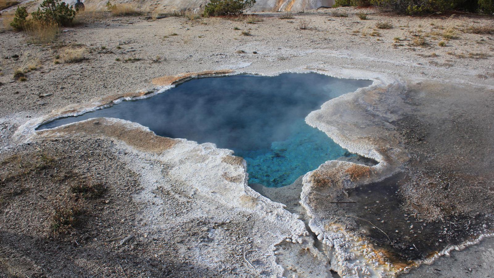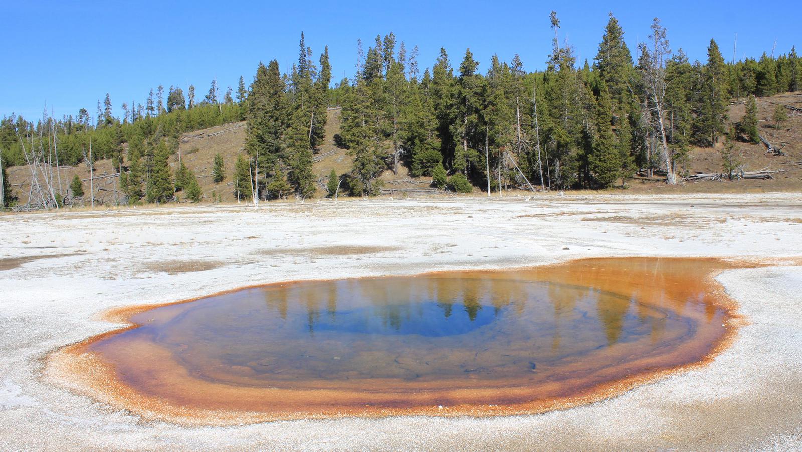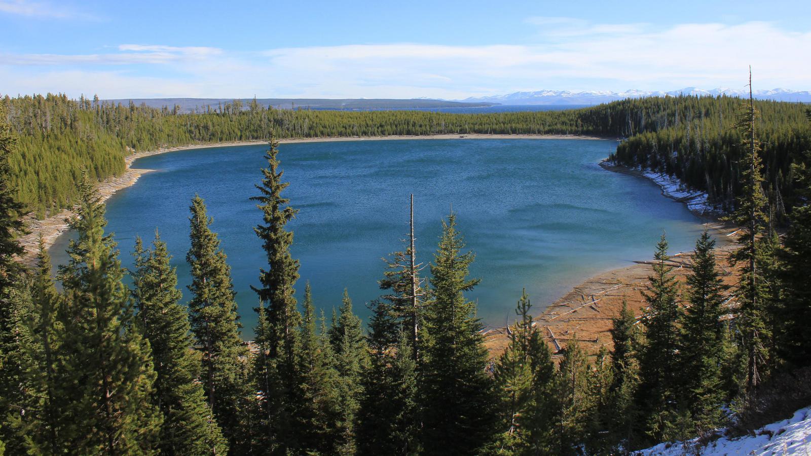 Nous nous arrêtons au West Thumb Geyser Basin. Nous retrouvons ici des piscines de taille et de couleur différentes, dont la magnifique Abyss pool, et quelques petits geysers ayant la particularité d'être entourés d'eau, au milieu du lac. Le lac de Yellowstone reste gelé jusqu'en juin et la présence de ces bains bouillonnants ne suffit pas à réchauffer ses eaux glaciales.