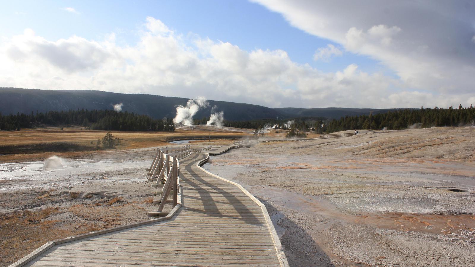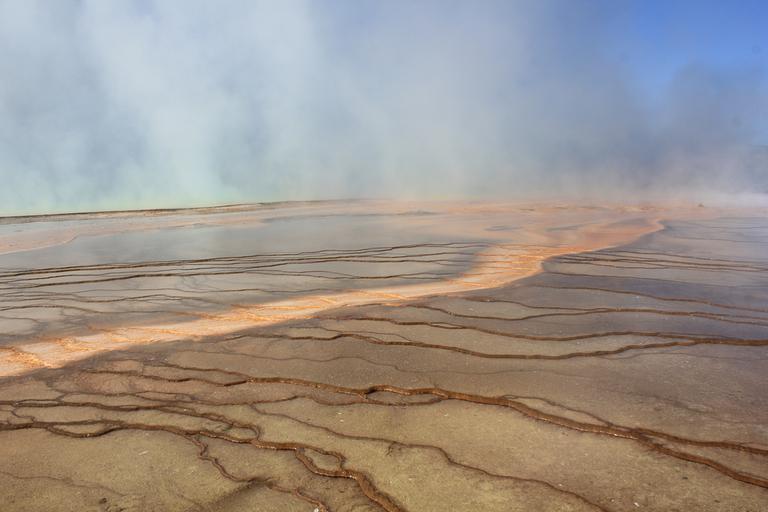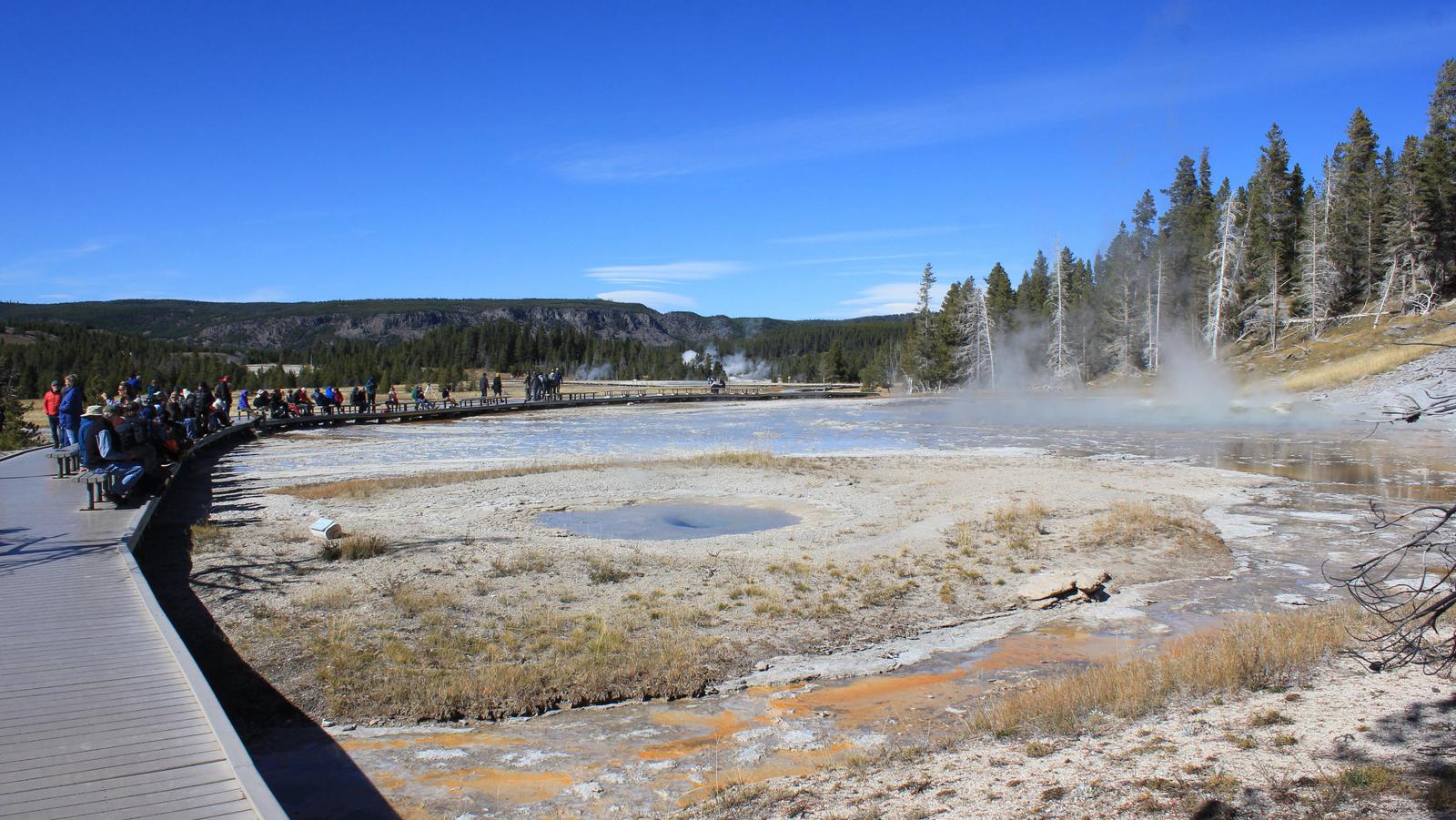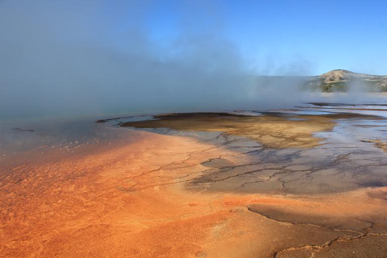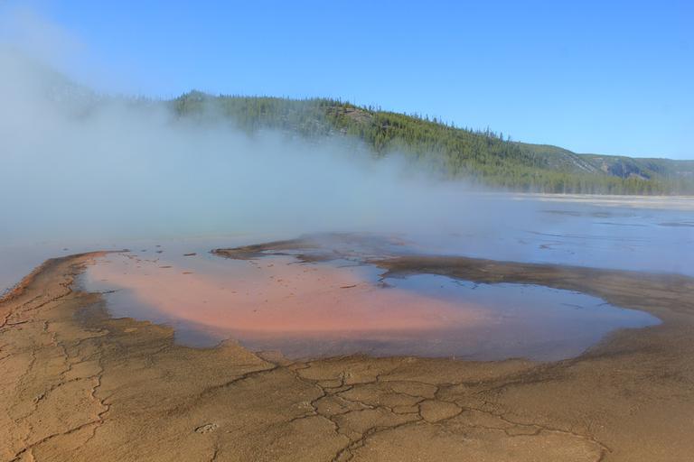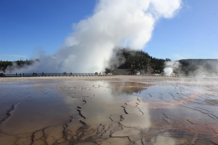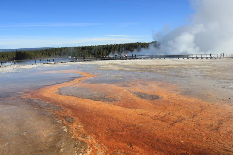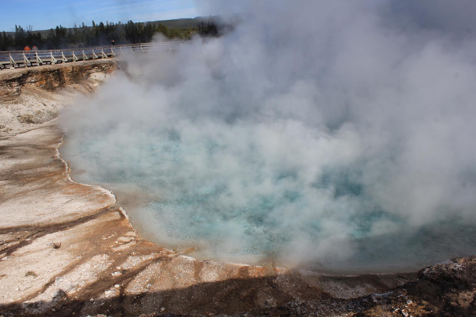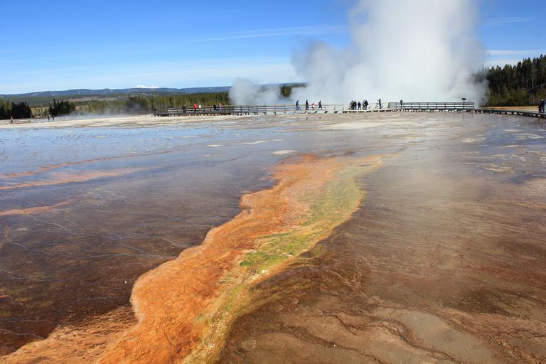 Nous franchissons le pont sur la Firehole River et grimpons l'escalier de bois vers l'Excelsior Geyser. C'est un énorme cratère couvert de vapeur dont on distingue à peine les eaux limpides. Nous poursuivons sur les chemins de planches et entrons dans le périmètre du célèbre Grand Prismatic.