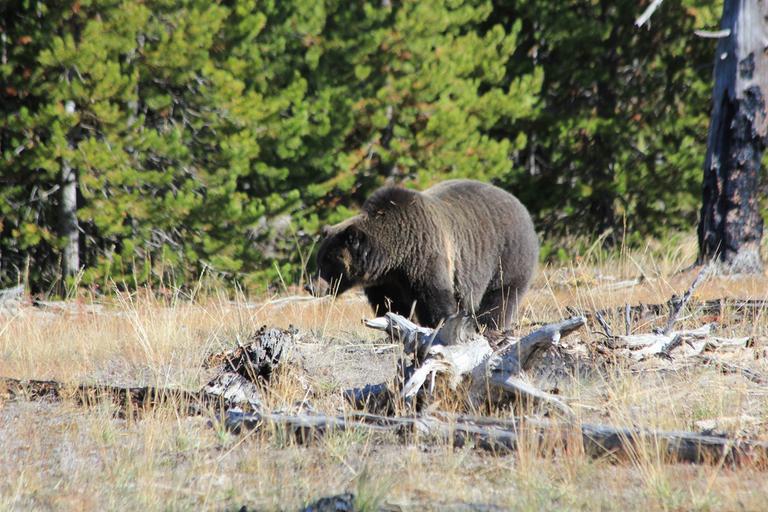 Nous parcourons quelques hectomètres, lorsque nous constatons soudain une dizaine de véhicules stoppés au milieu de la chaussée. Un grizzly est à quelques mètres de la route et cherche tranquillement sa nourriture...