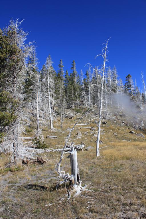 Nous partons directement au Visitor Center d'Old Faithfull pour voir les prévisions d'éruption et lire nos e-mails. Il fait très beau, mais tout à coup, à hauteur de Lower Geyser Basin, nous voici subitement plongés dans un énorme banc de brouillard. Nous venons de louper l'éruption du Great Fountain Geyser, un des plus grands geysers du monde...