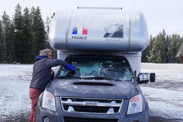 Il est presque 18h00 lorsque nous arrivons à West Yellowstone, la dernière localité avant l'entrée ouest du parc. Nous avons juste de temps de voir la dame du Visitor Center fermer ses portes. Il fait quelques degrés, la neige est annoncée pour cette nuit, nous nous installons près de la piste de l'ancien aéroport.