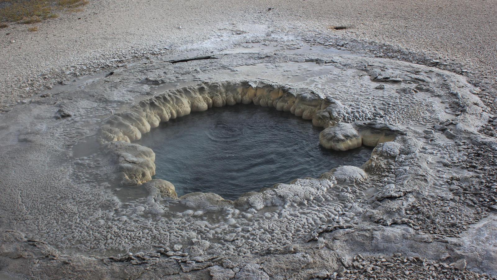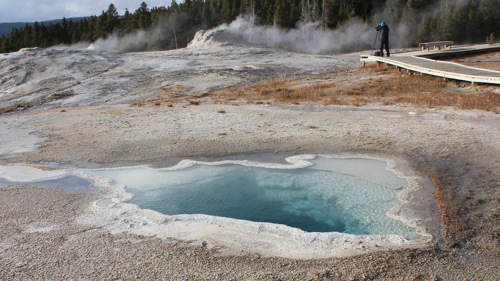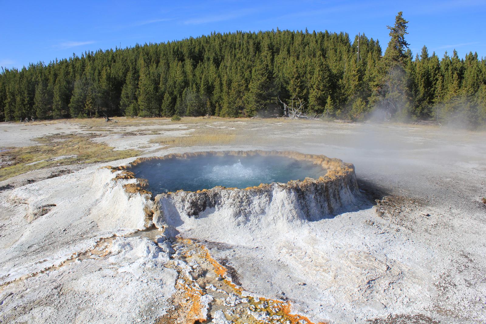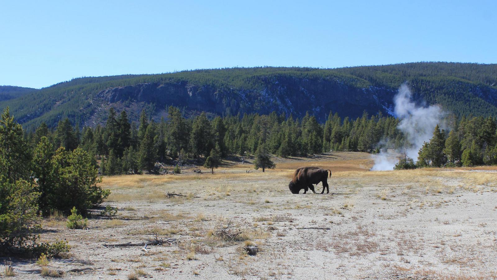 Comme devant le Old Faithfull Geyser, des bancs ont été installés en demi-cercle pour que le public puisse attendre confortablement l'éruption. Nous restons là et attendons, tandis qu'un gros bison se rapproche discrêtement dans notre dos.