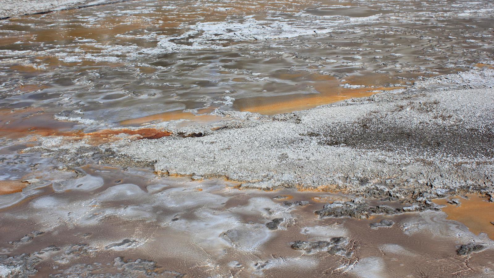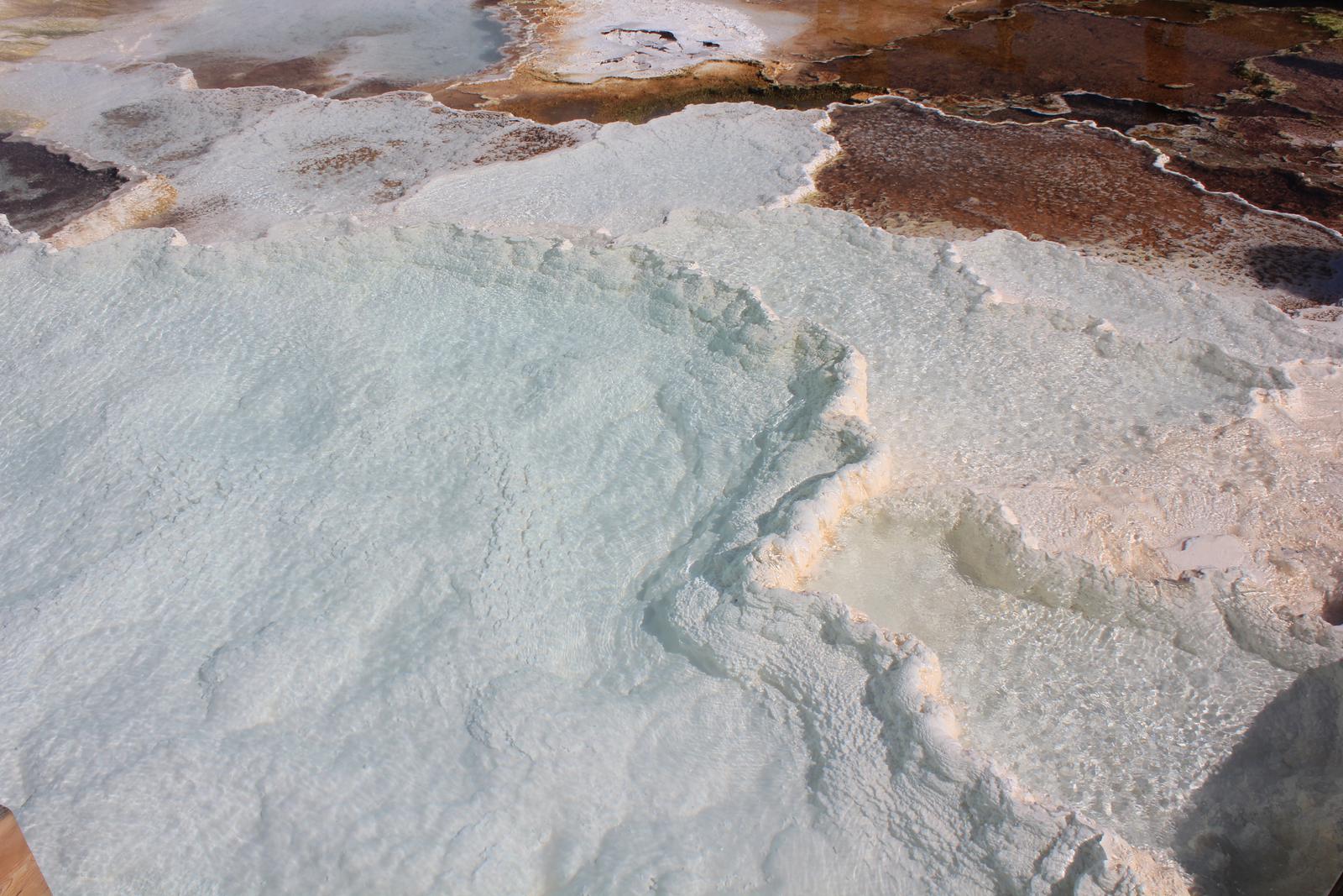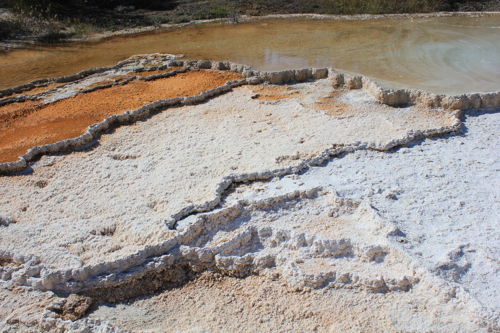 Nous sommes devant la plus grande piscine naturelle du parc. Les couleurs marron-orangée que nous avons sous les yeux sont extraordinaires, mais la partie centrale dont nous avons vu maintes fois les couleurs arc-en-ciel, est totalement cachée par un épais nuage de vapeur que le vent dirige vers nous. Un gros sentiment de frustration m'envahit, je me pose des questions : peut-être fait-il trop froid à cette saison ? Y-a-t-il trop de vent aujourd'hui ? Nous revenons à la voiture.