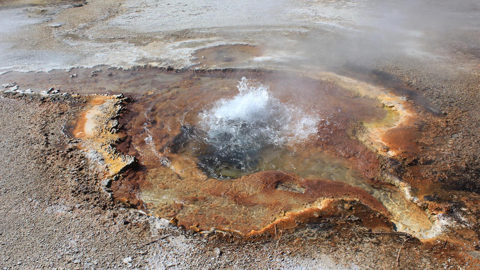 Nous découvrons une dizaine de bassins multicolores et geysers, nous prenons notre temps lorsque je m'aperçois que les bancs devant le Old Faithfull sont maintenant bien garnis. L'éruption va intervenir d'un instant à l'autre, nous pressons le pas et revenons vers le geyser...