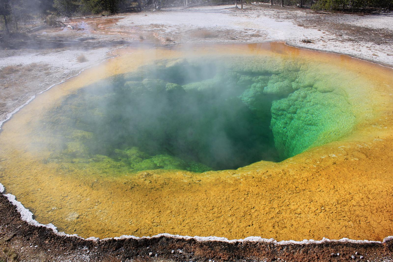 Nous reprenons notre promenade, l'émerveillement se poursuit jusqu'à son apothéose lorsque nous découvrons, tout au bout du parcours, le bassin Morning Glory Pool aux couleurs et à la transparence irréelles...