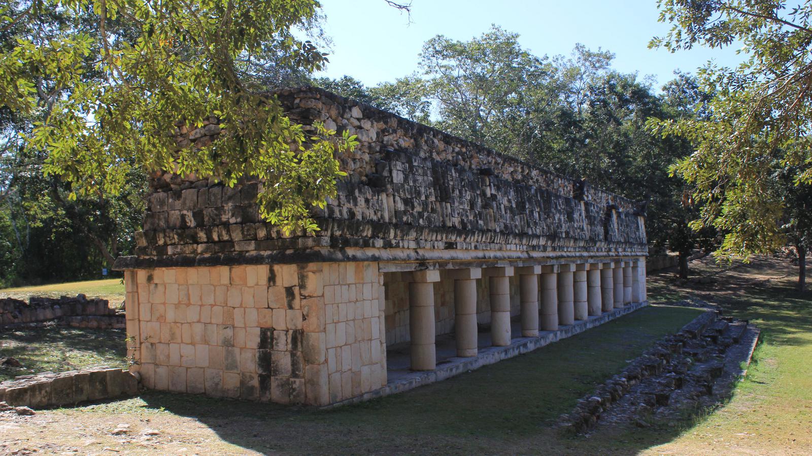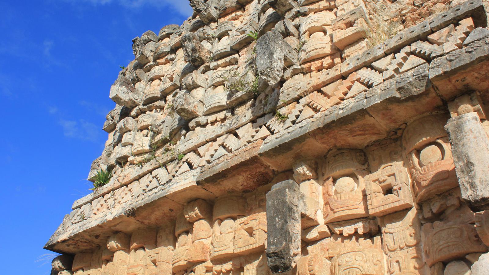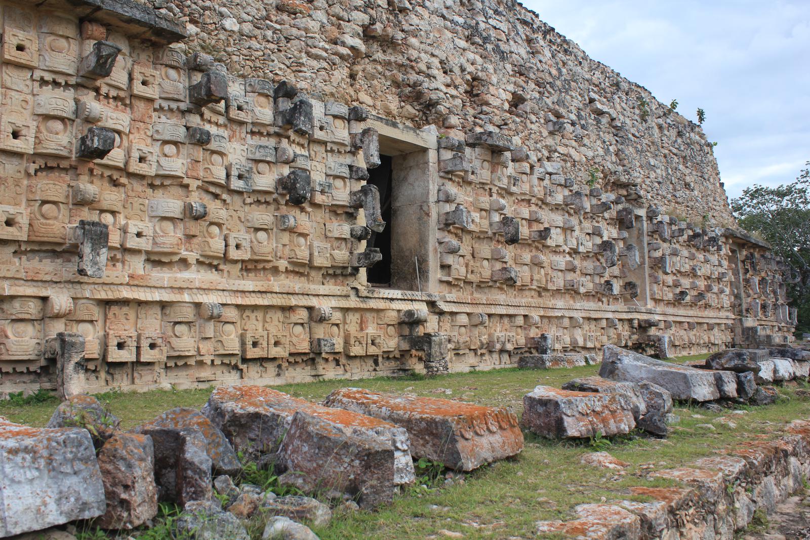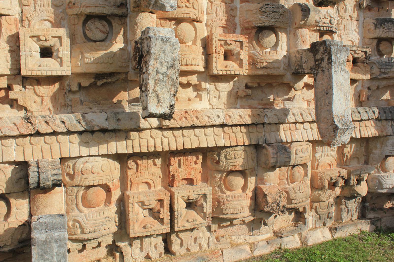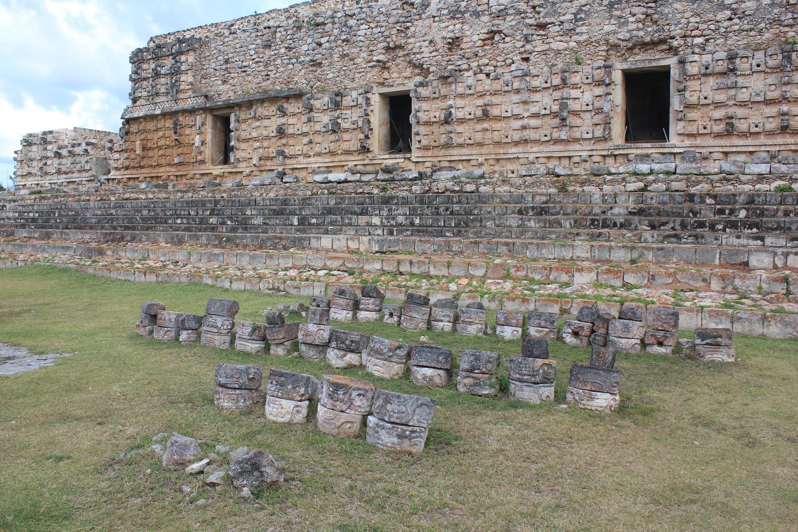 Le site de Kabah couvre 3km2, dont une partie se trouve encore recouverte de forêt. Il est scindé en deux par la route par laquelle nous sommes arrivés. il a connu son apogée entre les ans 700 et 1000 et comporte des pyramides et des palais. Le premier que nous découvrons est le Gran Palacio, cependant le plus remarquable est le Palais des Masques, Codz Poop en maya. Sa façade principale, longue de 46m, est ornée d'une succession ininterrompue de 260 masques du dieu Chaac, le dieu de la pluie, au nez crochu. La plupart des nez de pierre sont cassés mais quelques-uns ont été préservés. Dans cette région très fertile, l'eau était rare et les populations avaient construit d'importants réservoirs souterrains, les chultunes, qui ne pouvaient se remplir que lors des pluies.