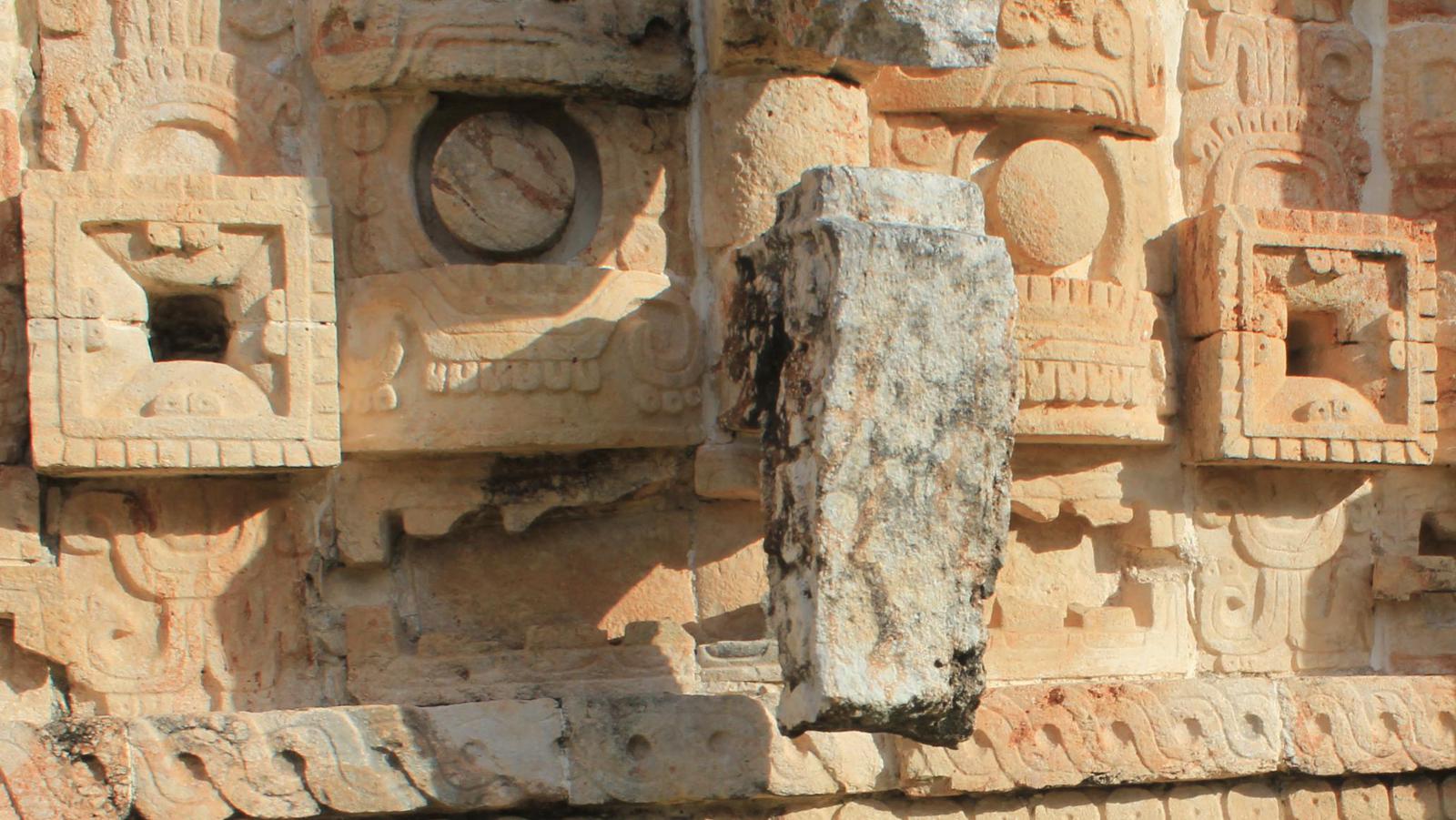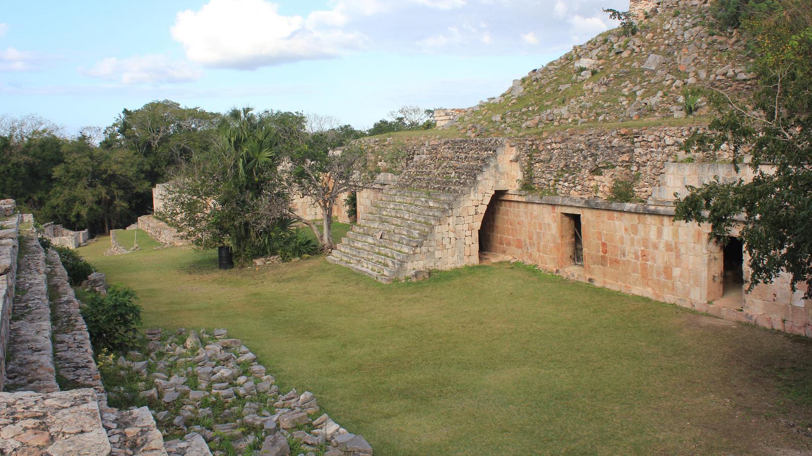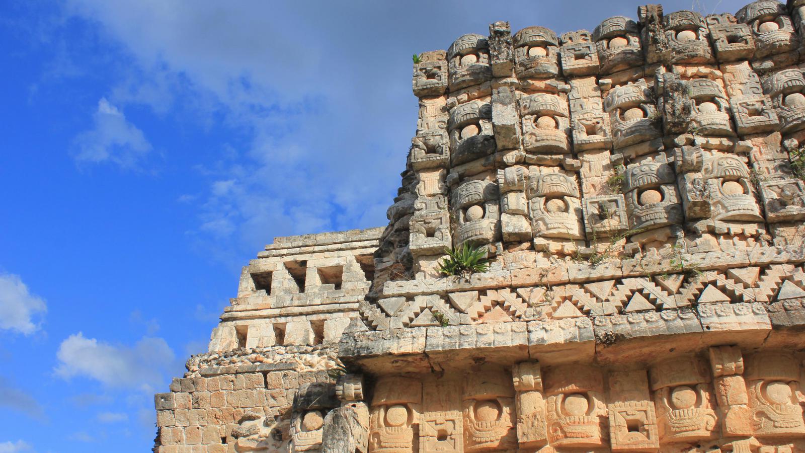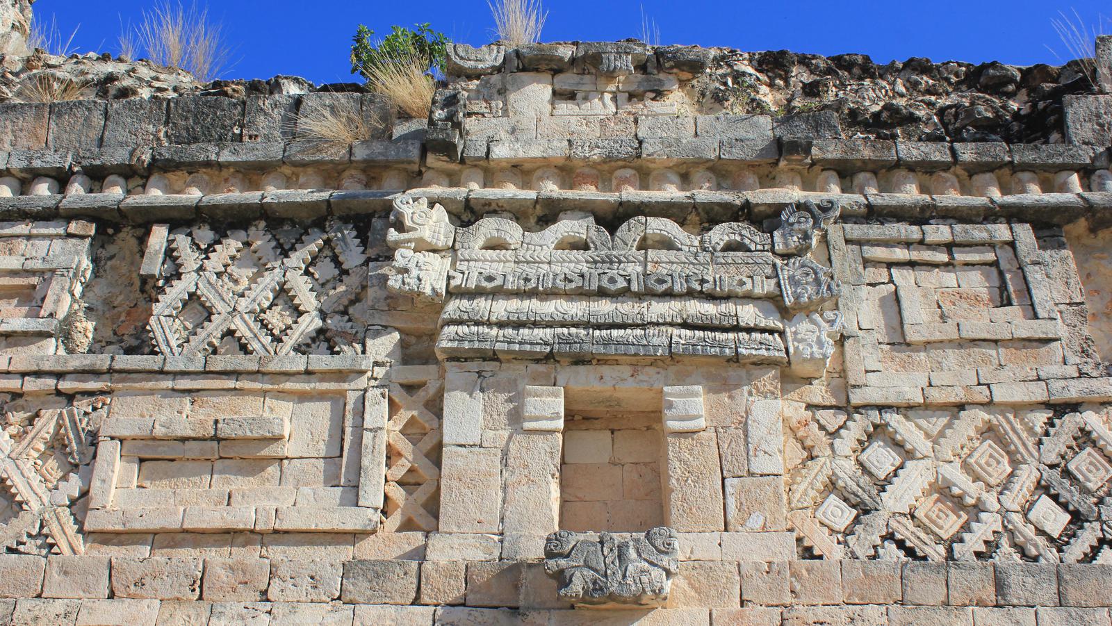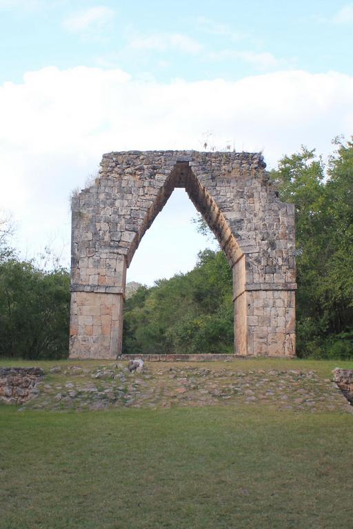 Le site de Kabah couvre 3km2, dont une partie se trouve encore recouverte de forêt. Il est scindé en deux par la route par laquelle nous sommes arrivés. il a connu son apogée entre les ans 700 et 1000 et comporte des pyramides et des palais. Le premier que nous découvrons est le Gran Palacio, cependant le plus remarquable est le Palais des Masques, Codz Poop en maya. Sa façade principale, longue de 46m, est ornée d'une succession ininterrompue de 260 masques du dieu Chaac, le dieu de la pluie, au nez crochu. La plupart des nez de pierre sont cassés mais quelques-uns ont été préservés. Dans cette région très fertile, l'eau était rare et les populations avaient construit d'importants réservoirs souterrains, les chultunes, qui ne pouvaient se remplir que lors des pluies.