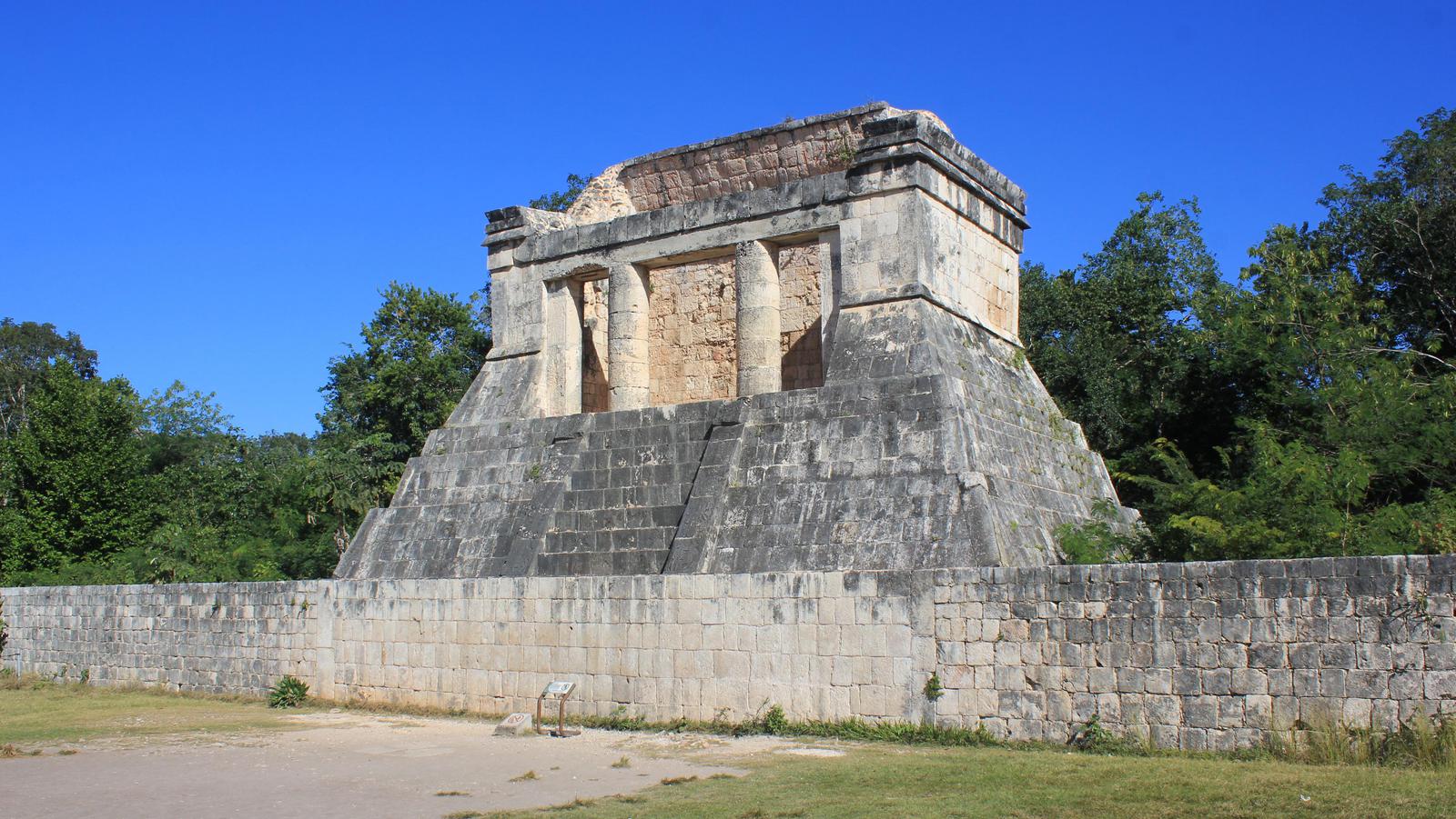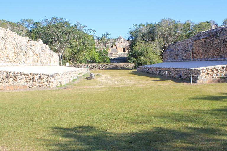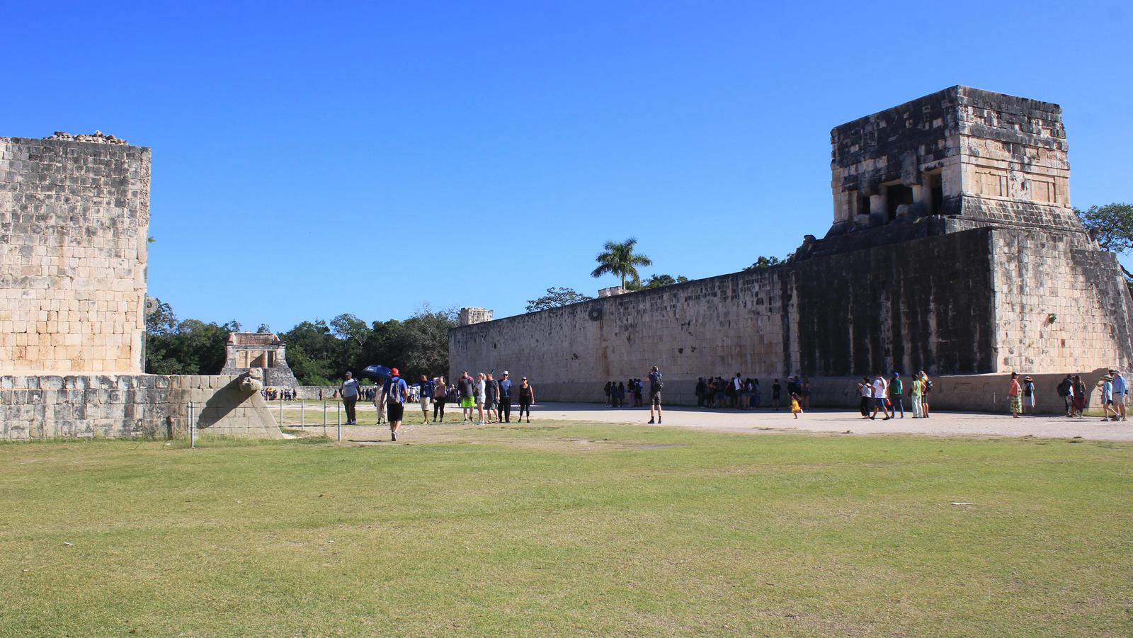 Nous traversons le Jeu de Pelote. Le terrain est longé par deux murs en pierre équipés chacun d'un anneau. Les joueurs devaient faire passer une balle dans ces derniers en s'aidant des genoux, des coudes, des hanches ou des fesses, mais sans les pieds ni les mains. Au-delà du terrain, nous arrivons au pied de la Grande Pyramide.