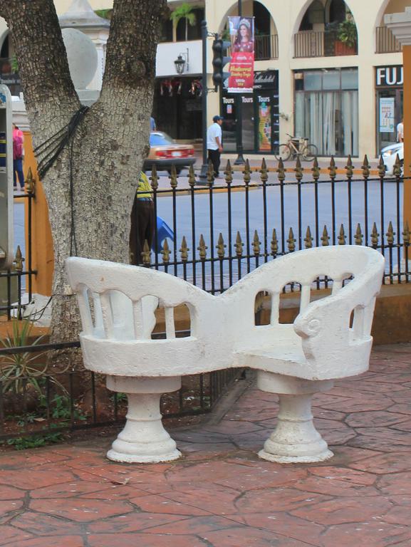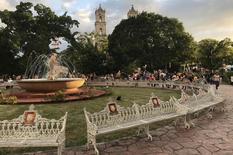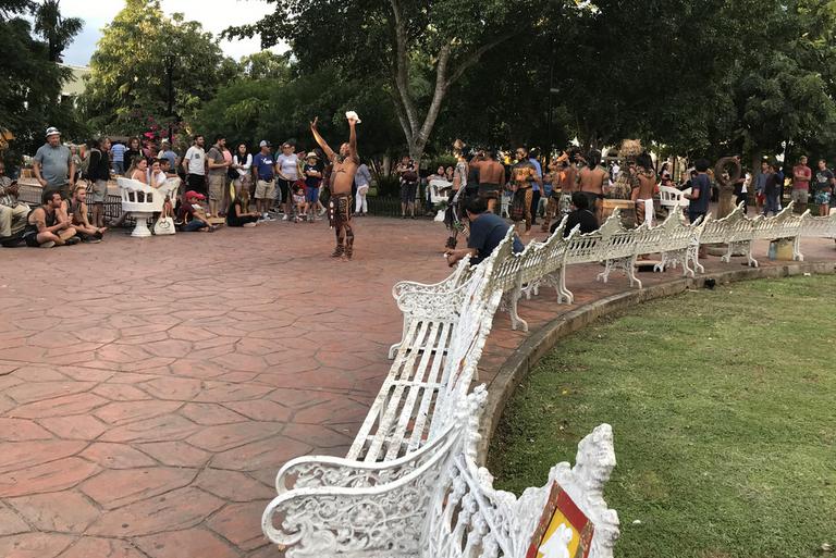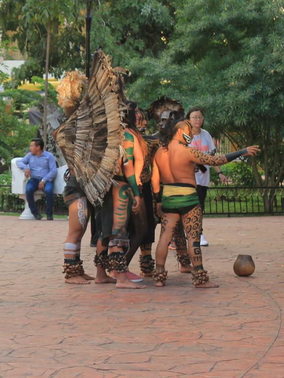 Nous arrivons sur le Parque la Mestiza, la place animée de la ville. Les deux tours de la cathédrale de San Servacio se dressent devant nous. Les cars qui amènent les touristes de Cancun à Chichen-Itza font une halte sur cette place au retour, ce qui explique en grande partie l'animation de cette fin d'après-midi. Une troupe de danseurs mayas assure le spectacle, alternant danses et jeux de balle.