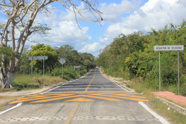 Nous reprenons la route d'Izamal. Celle-ci traverse la jungle sèche en ligne droite et la dense végétation tend à se resserrer sur la chaussée. Il convient donc d'être très vigilant, sur les côtés, pour guetter les arrivées éventuelles d'animaux, et devant, pour ne pas se laisser surprendre par un trou ou un tope non signalé. Autant dire que, dans ces conditions, les 80 kilomètres paraissent interminables...