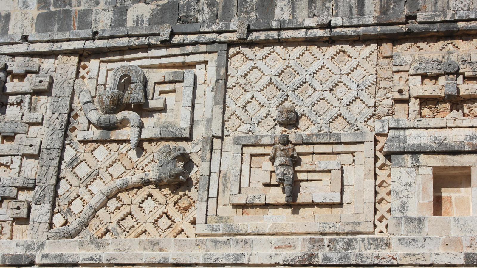 En continuant la visite, nous découvrons le Quadrilatère des Nonnes. C'est un ensemble de quatre édifices entourant une vaste cour intérieure de 65m x 45m. Nous retrouvons ici le style Puuc que nous venons de découvrir à Kabah, les bâtiments sont ornés de symboles dont les fameux masques Chaac, les serpents à plume et les frises aux motifs géométriques.