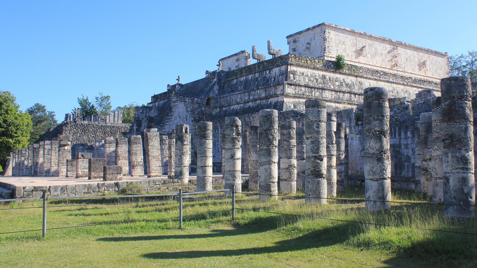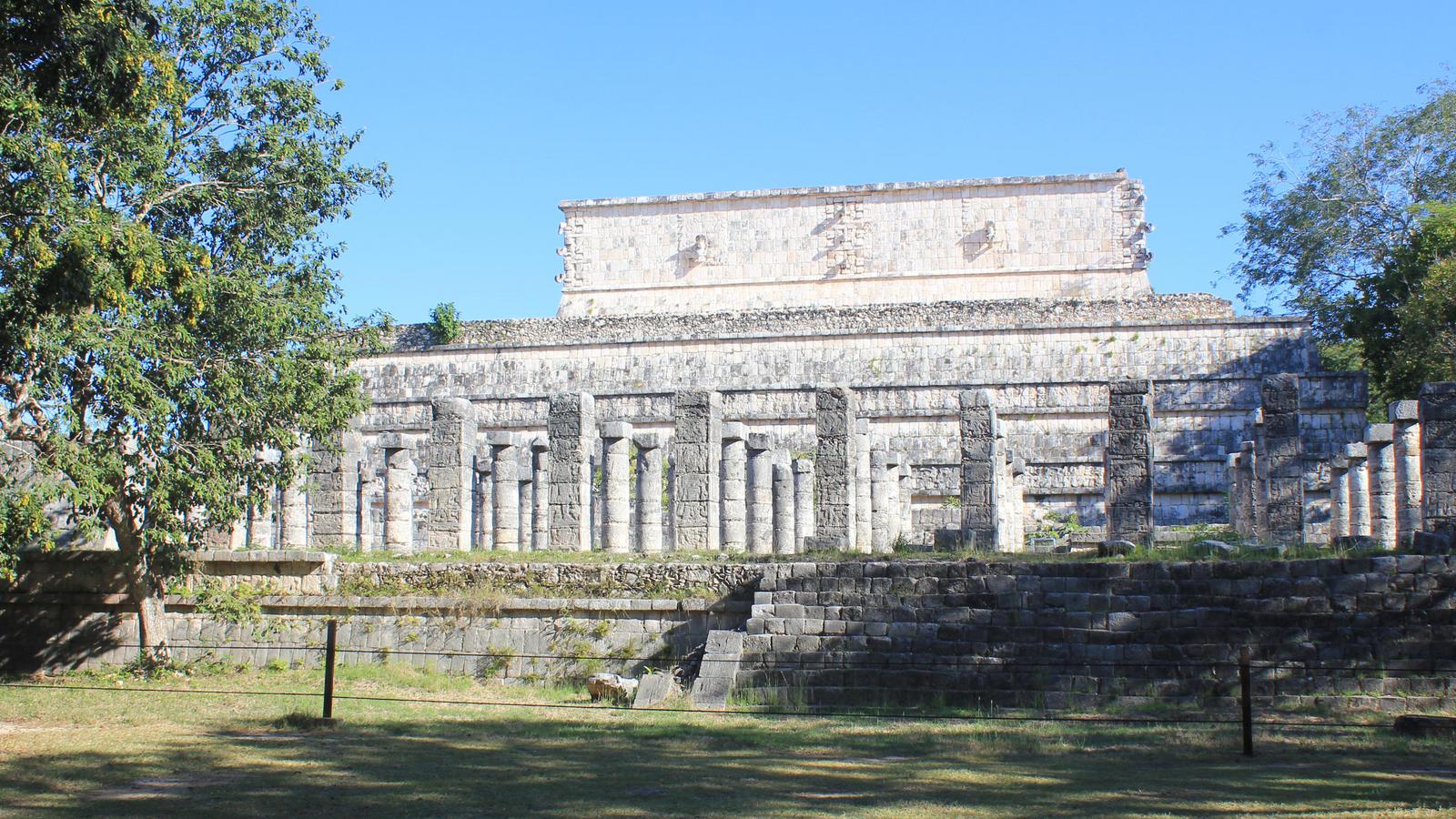 Nous apercevons, derrière la pyramide, le Groupe des Mille Colonnes et le Temple des Guerriers. L'accès est interdit au public et nous devons nous contenter de regarder cet édifice derrière une clôture.