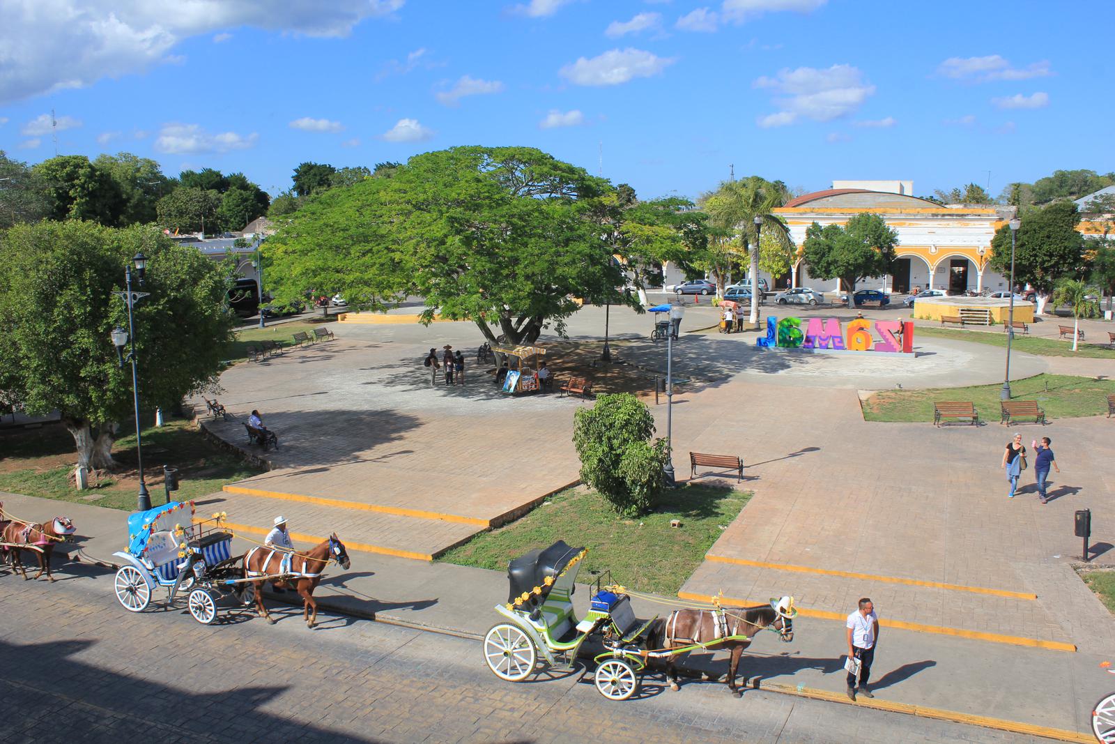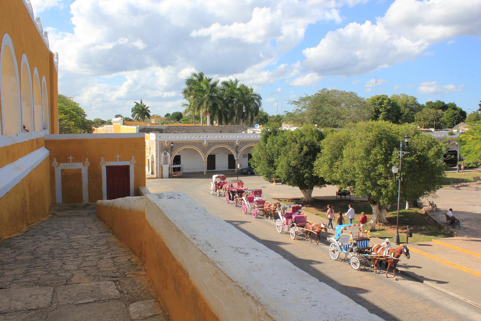 Nous arrivons à Izamal. Nous trouvons une place pour nous garer autour du Parque Izamna, au pied du couvent San Antonio de Padua, pas très loin des calèches qui attendent les touristes.